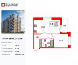 Удобная, классическая, функциональная европланировка, большая кухня-гостиная 17.35 м², просторная прихожая 7.35 м². Общая площадь квартиры - 38.51 м², жилая 10.09 м², высота потолка 2.77 м.