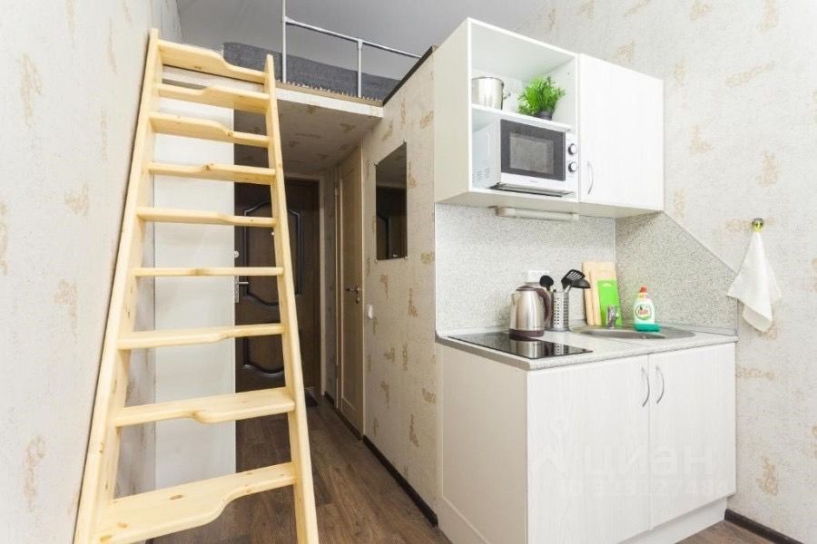 организованно уютное пространство для жизни и отдыха + выделенное пространство для сна на 2 уровне, а также, кухонная зона и сан узел