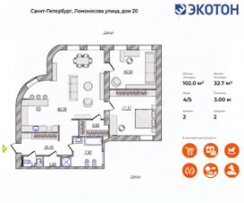 Планировка включает в себя просторную кухню-гостиную 43,7 кв. м., спальню, кабинет, 2 санузла, гардеробную и кладовую. В квартире выполнен капитальный ремонт с полным демонтажем и заменой коммуникаций.
