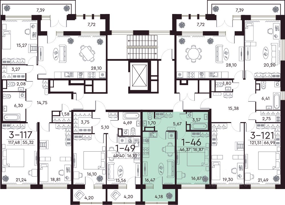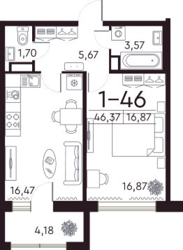 Квартира находится в 8 этажном доме, в Дом 3 на 7 этаже. Общая площадь квартиры 46,40 кв.м.
