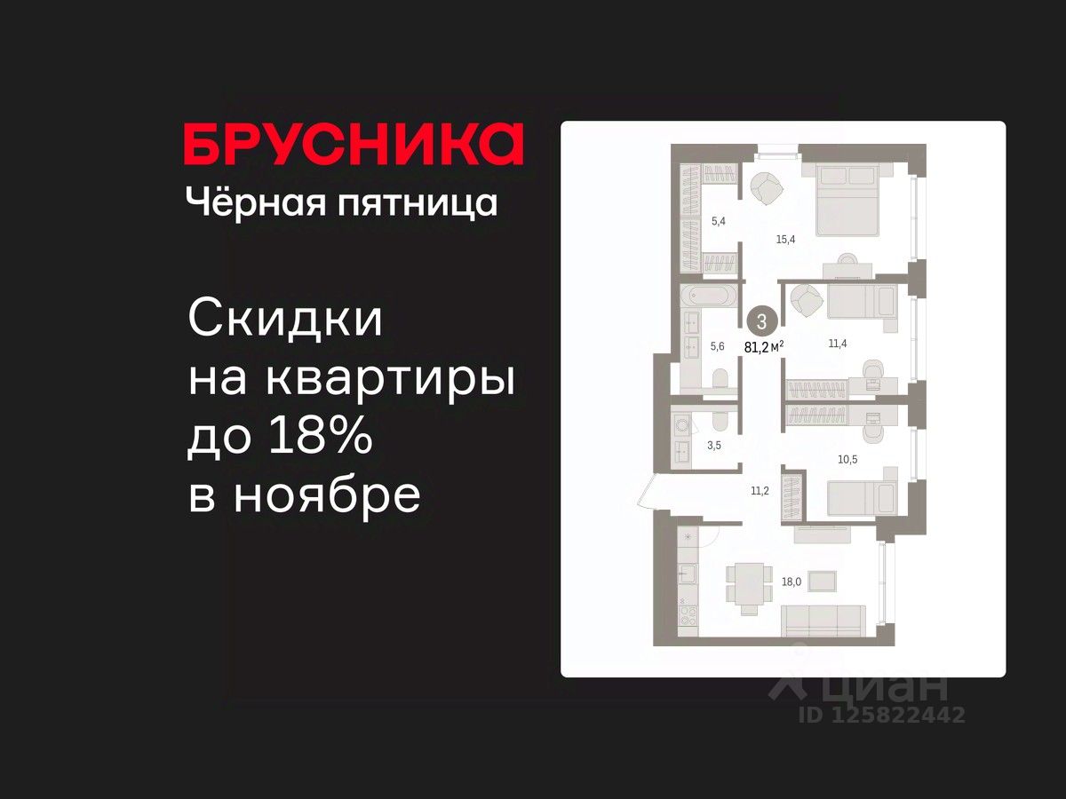 Трехкомнатная квартира от застройщика с предчистовой отделкой в ЖК "Брусника в Новоселье" на 1 этаже. Общая площадь: 81.17 кв.м., жилая: 37.3 кв.м., площадь просторной кухни-столовой: 18 кв.м. Комнаты изолированные, все окна выходят на одну сторону. В квартире один совмещенный и один раздельный санузел. Высота потолков 2.7 м.