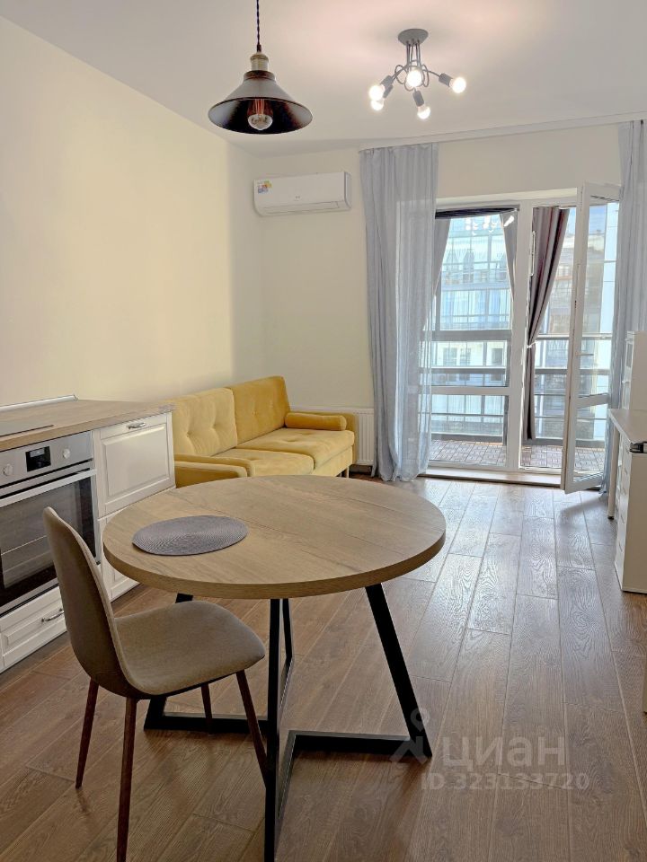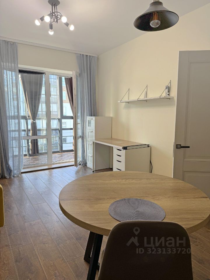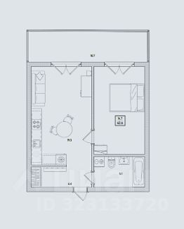 Кухня-гостиная площадью почти в 20 метров ведет на просторный(более 1.5 м ширины) балкон. Дополнительный объем визуально достигается благодаря повышенной площади остекления.