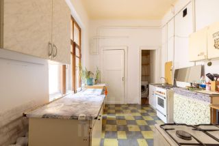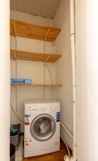- На кухне удобное место со столом, отдельная кладовая со стиральной машиной и стеллажом для хранения;