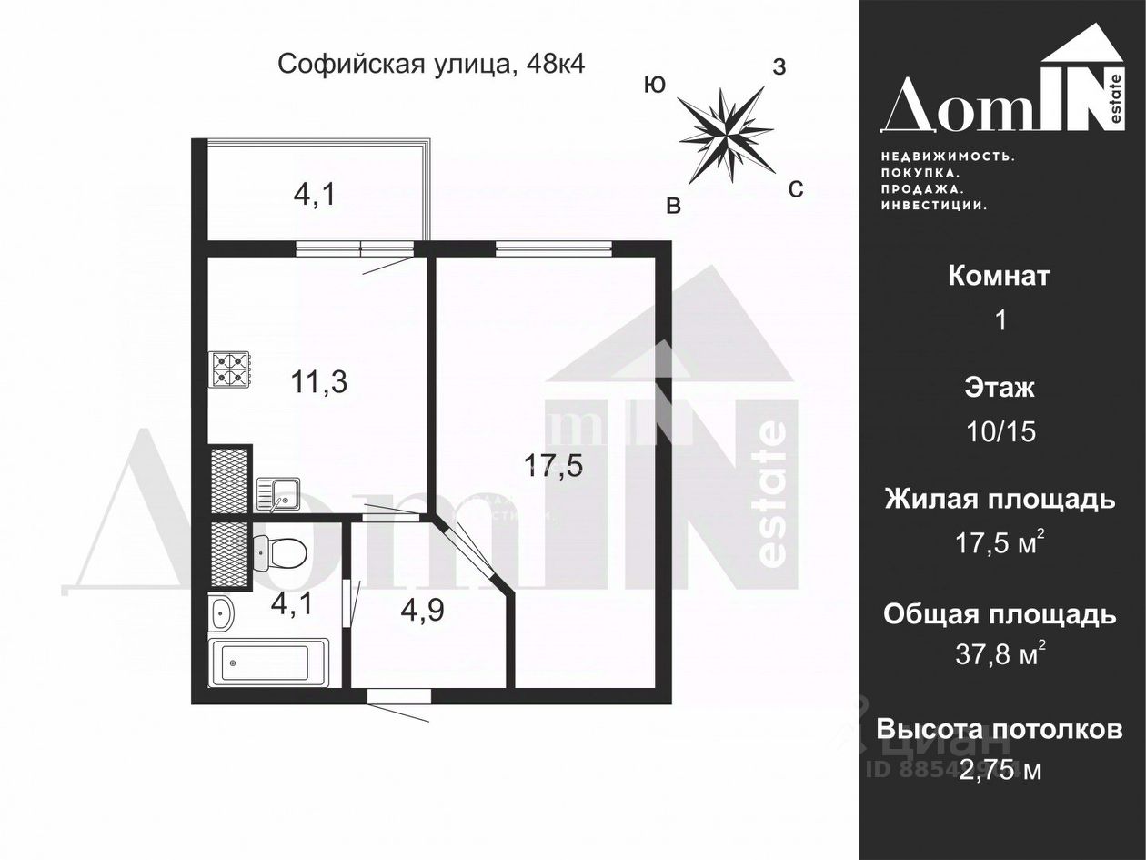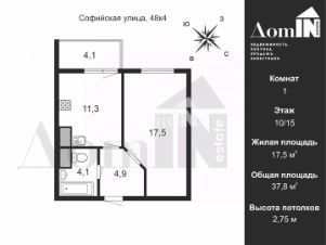 Квартира расположена на 10 этаже, 15-ти этажного дома. Просторная комната S - 17 кв.м., кухня - S - 11кв.м. Все, что вы видите на фото, остается в квартире.