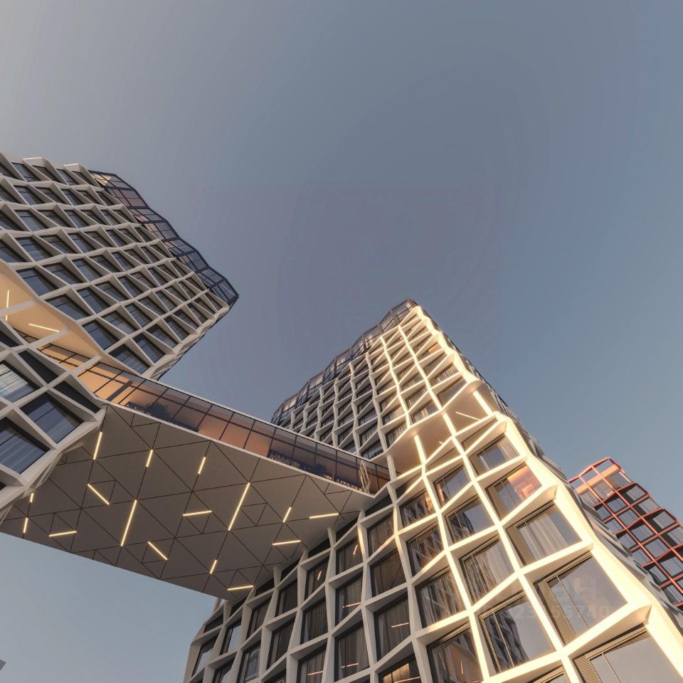 Футуристичная архитектура от "А.Лен" 5 разновысотных башен: CARBON, CUPRUM, TITAN, PLATINA и WOLFRAM (от 18 до 22 этажей)