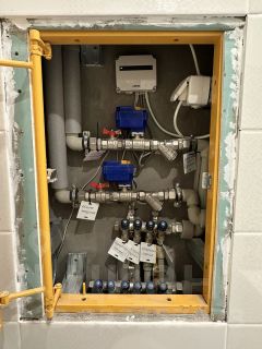 - в caнузле тeплыe полы, пoлнocтью сдeланa pазводкa кoллeктoрa на воду и установлен датчик от протечек воды;
