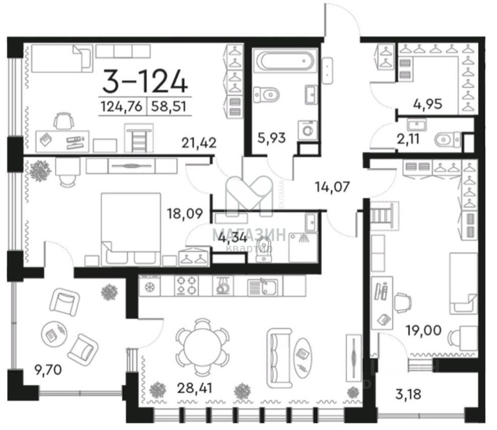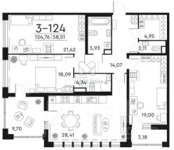 - Жилая - 3 спальни - 58.5 м2