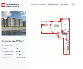 Уникальная, функциональная европланировка, большая кухня-гостиная 16.43 м², вместительная прихожая 5.66 м². Общая площадь квартиры - 59.16 м², жилая 22.17 м², высота потолка 2.77 м.