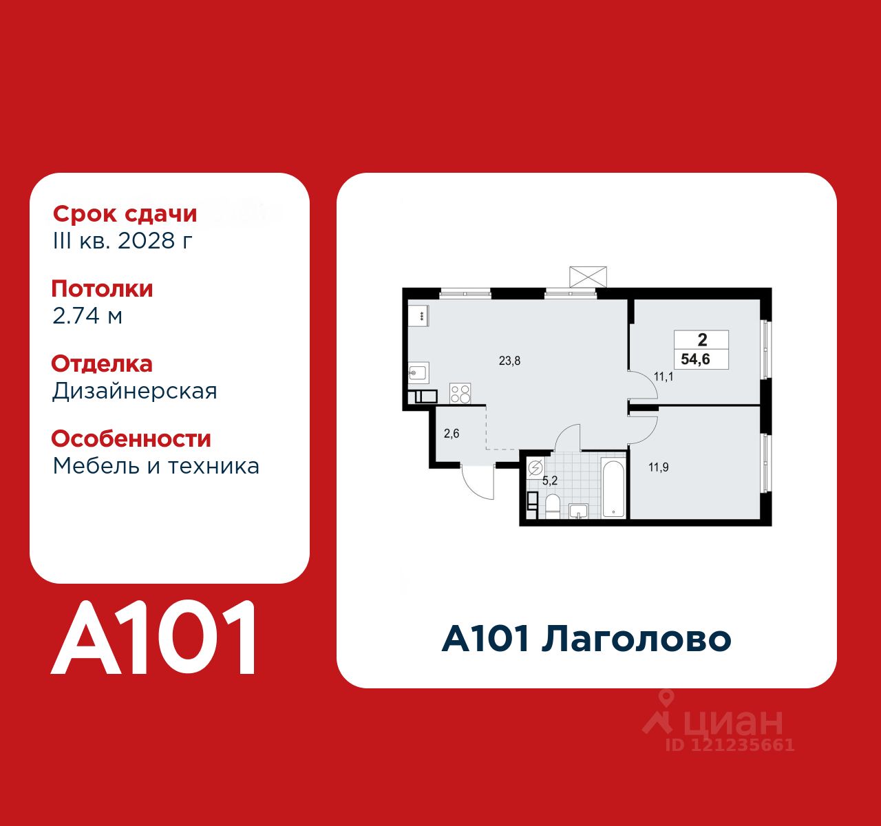 2-комнатная квартира площадью 54.56 в ЖК "А101 Лаголово" на 3 этаже. Квартира с отделкой. Вид из окна во двор. В квартире 1 санузел. Высота потолков 2.74 м. Ключи в 2025 году.