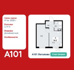 Старт продаж! 1-комнатная квартира площадью 34.29 в ЖК "А101 Лаголово" на 3 этаже. Квартира с отделкой. Вид из окна во двор. В квартире 1 санузел. Высота потолков 2.74 м.