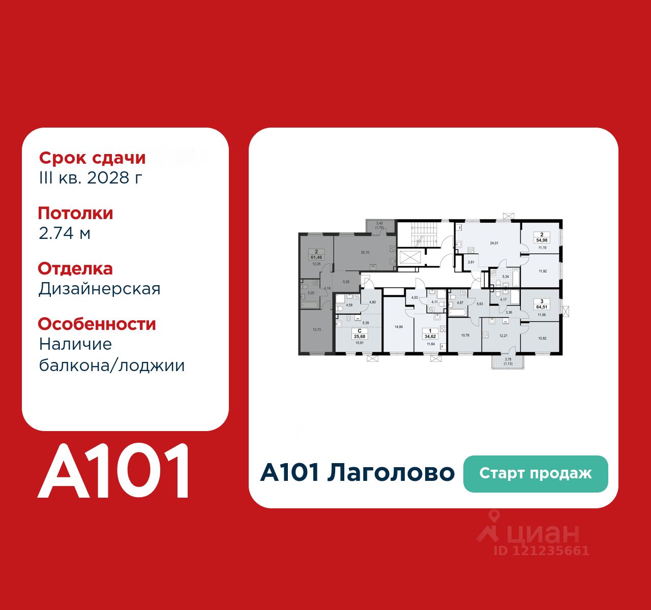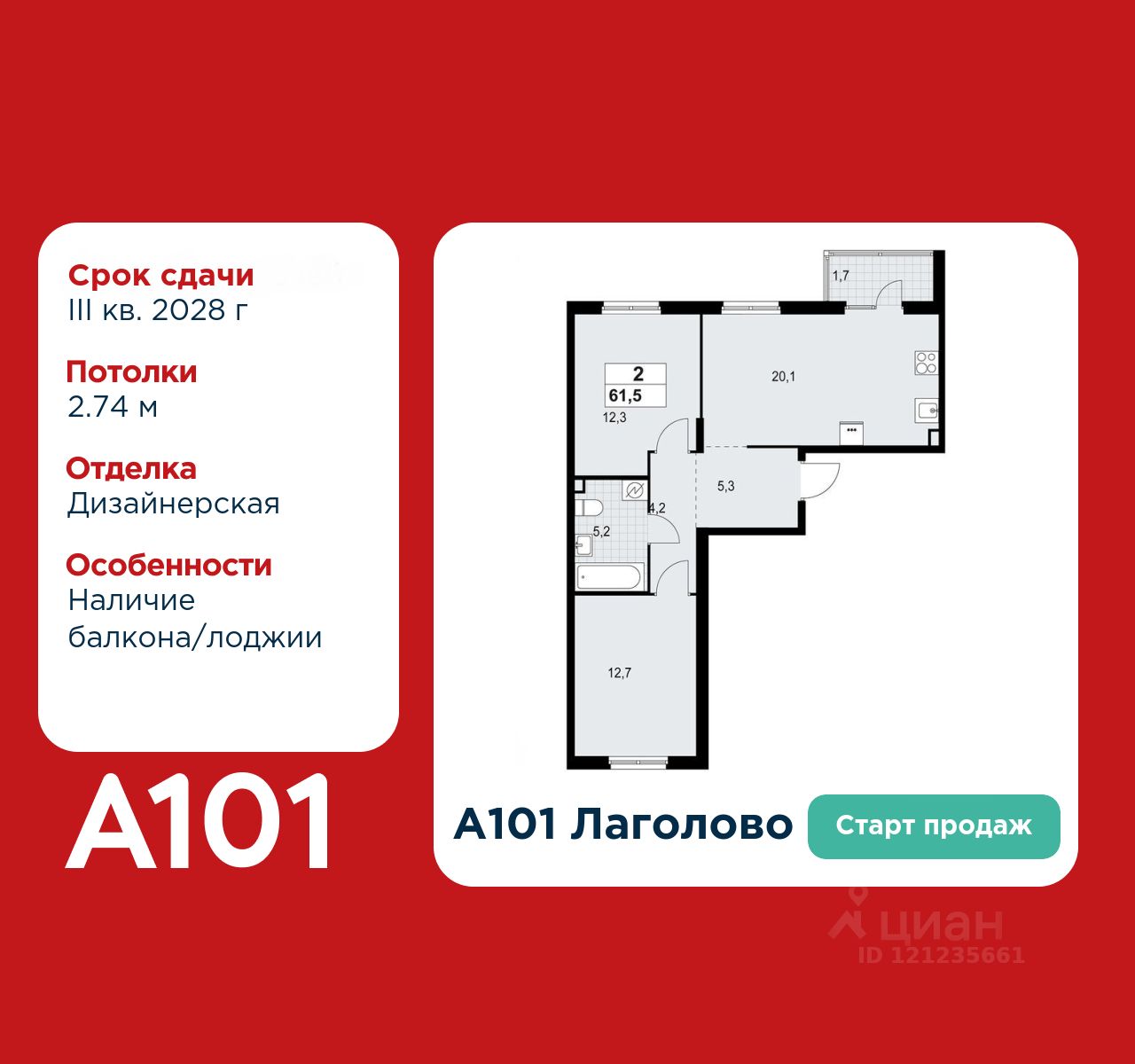 Старт продаж! 2-комнатная квартира площадью 61.46 в ЖК "А101 Лаголово" c балконом на 2 этаже. Квартира с отделкой. Вид из окна во двор. В квартире 1 санузел. Высота потолков 2.74 м.