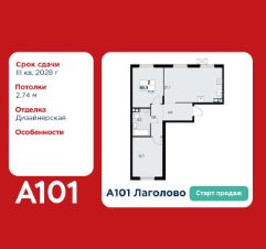 Старт продаж! 2-комнатная квартира площадью 60.92 в ЖК "А101 Лаголово" на 8 этаже. Квартира с отделкой. Вид из окна на улицу. В квартире 1 санузел. Высота потолков 2.74 м.