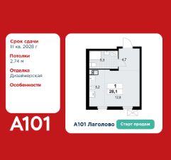 Старт продаж! Студия площадью 28.07 в ЖК "А101 Лаголово" на 8 этаже. Квартира с отделкой. Вид из окна во двор. В квартире 1 санузел. Высота потолков 2.74 м.