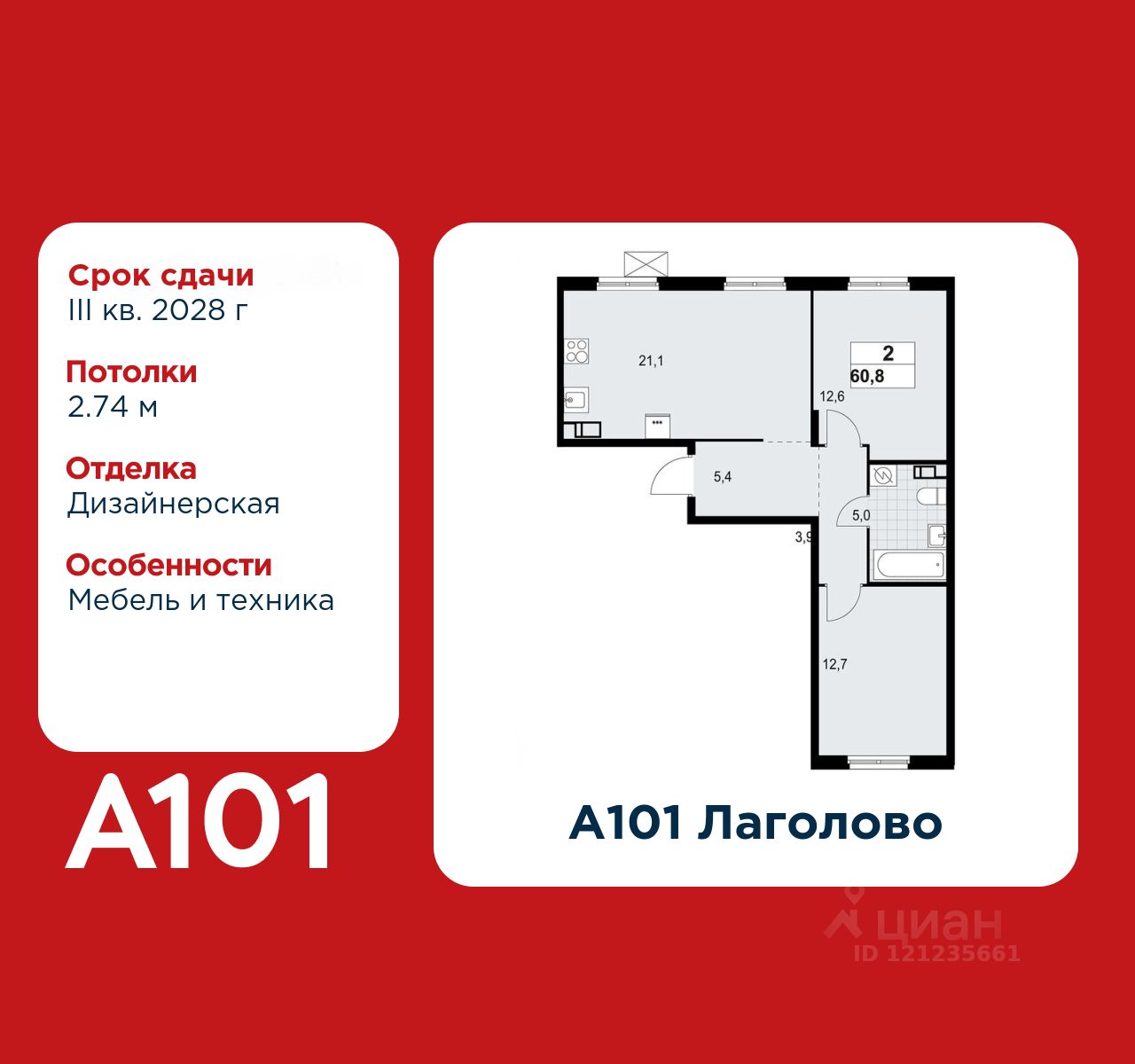 2-комнатная квартира площадью 60.76 в ЖК "А101 Лаголово" на 8 этаже. Квартира с отделкой. Вид из окна на улицу. В квартире 1 санузел. Высота потолков 2.74 м. Ключи в 2025 году.