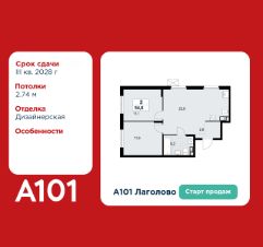 Старт продаж! 2-комнатная квартира площадью 54.57 в ЖК "А101 Лаголово" на 6 этаже. Квартира с отделкой. Вид из окна во двор. В квартире 1 санузел. Высота потолков 2.74 м.
