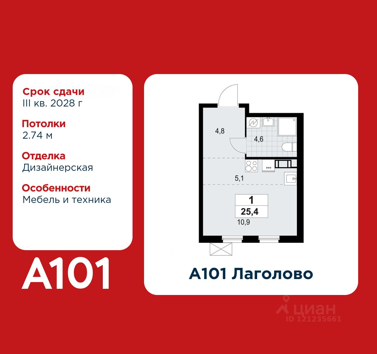 Студия площадью 25.35 в ЖК "А101 Лаголово" на 6 этаже. Квартира с отделкой. Вид из окна во двор. В квартире 1 санузел. Высота потолков 2.74 м. Ключи в 2025 году.