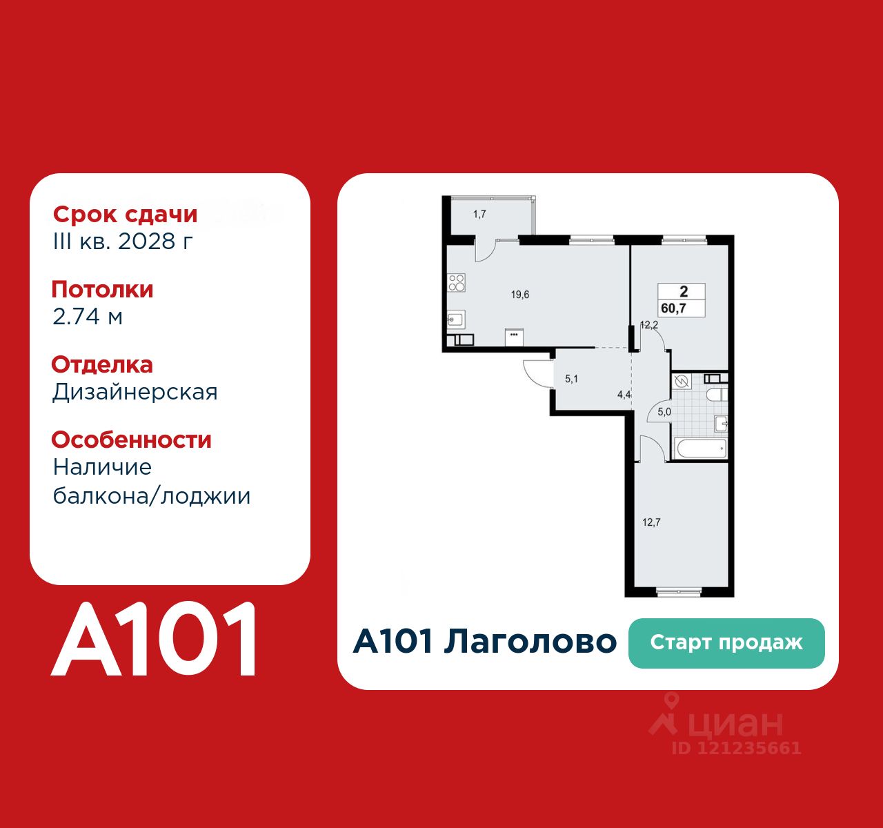 Старт продаж! 2-комнатная квартира площадью 60.72 в ЖК "А101 Лаголово" c балконом на 6 этаже. Квартира с отделкой. Вид из окна во двор. В квартире 1 санузел. Высота потолков 2.74 м.