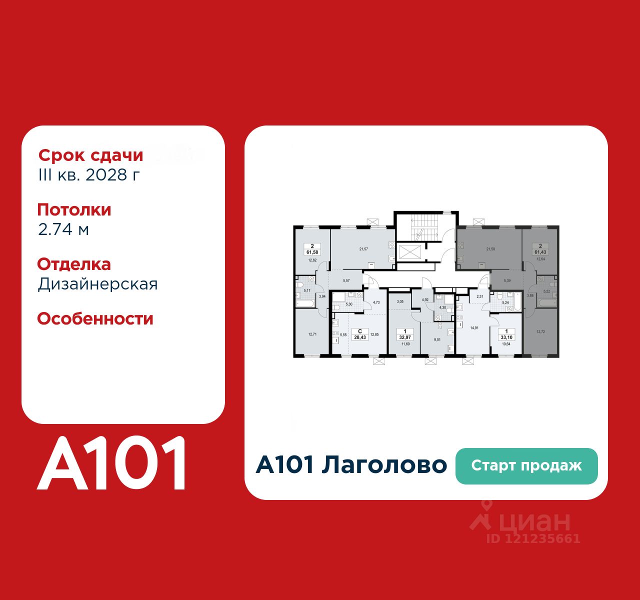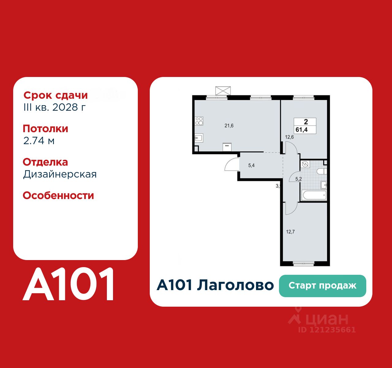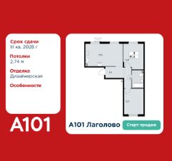 Старт продаж! 2-комнатная квартира площадью 61.43 в ЖК "А101 Лаголово" на 2 этаже. Квартира с отделкой. Вид из окна во двор. В квартире 1 санузел. Высота потолков 2.74 м.