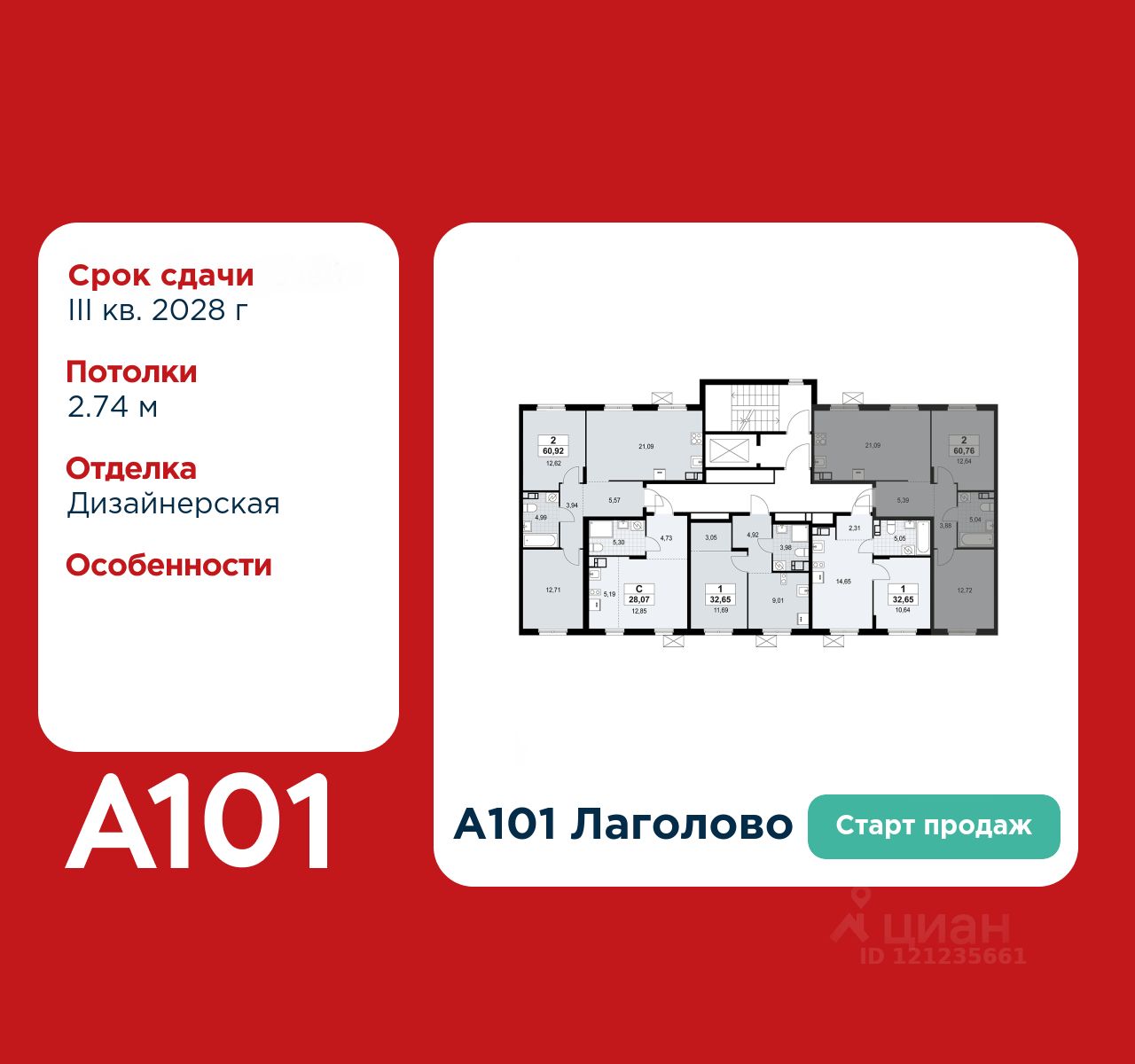 Старт продаж! 2-комнатная квартира площадью 60.76 в ЖК "А101 Лаголово" на 4 этаже. Квартира с отделкой. Вид из окна на улицу. В квартире 1 санузел. Высота потолков 2.74 м.