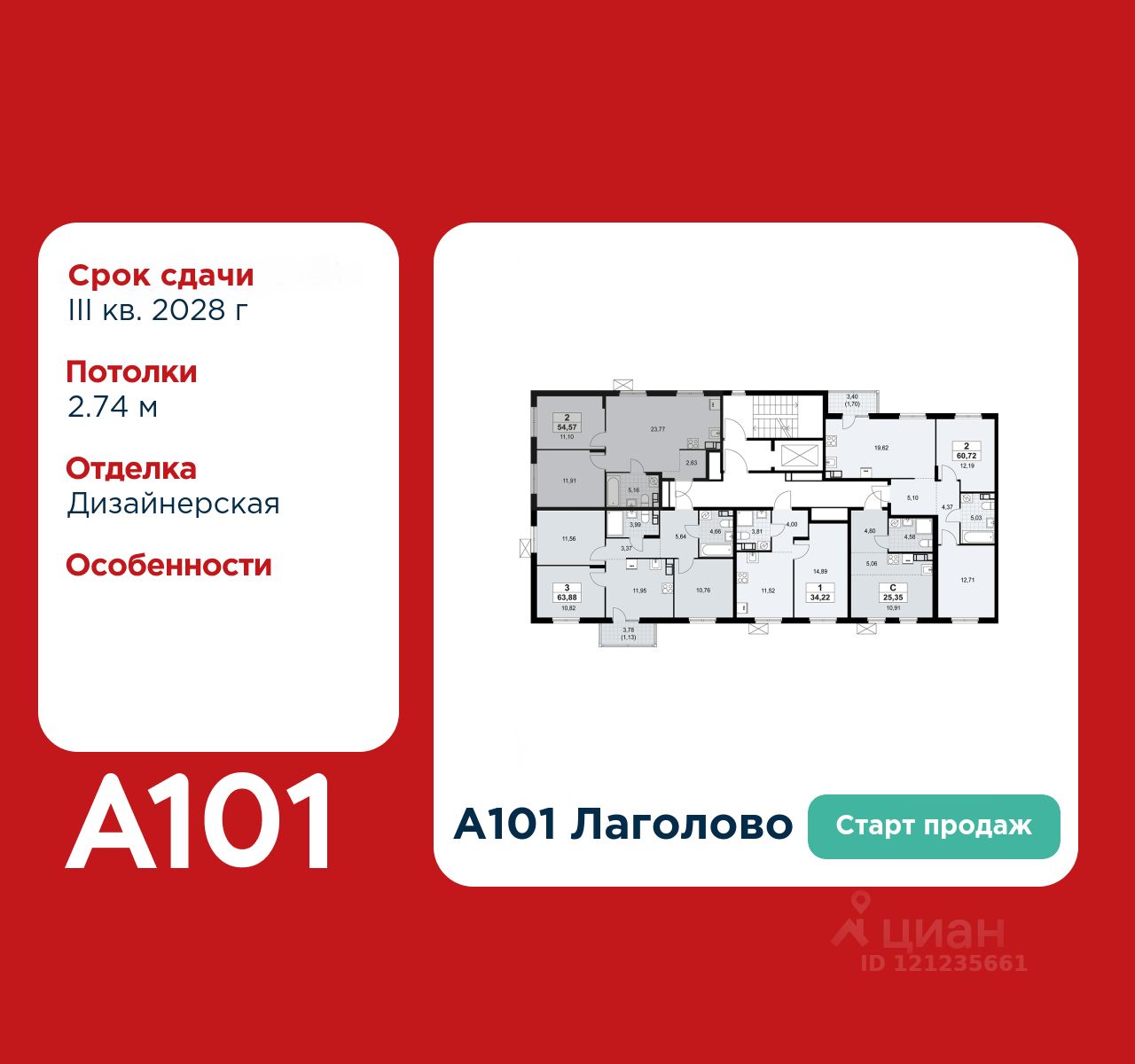 Старт продаж! 2-комнатная квартира площадью 54.57 в ЖК "А101 Лаголово" на 3 этаже. Квартира с отделкой. Вид из окна на улицу. В квартире 1 санузел. Высота потолков 2.74 м.