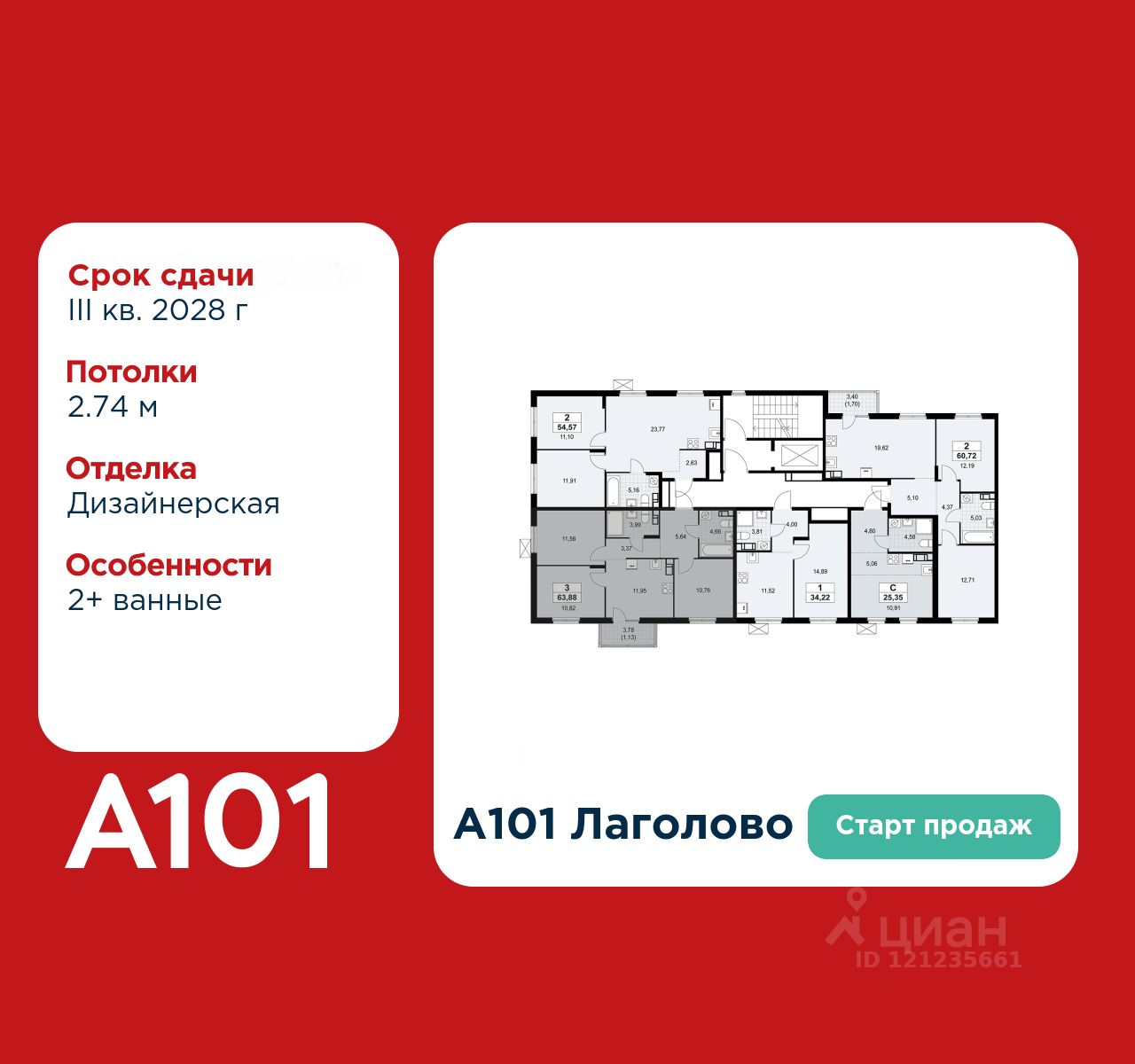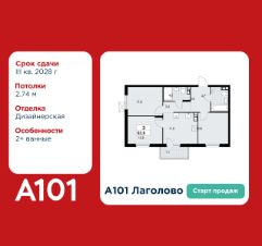 Старт продаж! 3-комнатная квартира площадью 63.88 в ЖК "А101 Лаголово" c балконом на 3 этаже. Квартира с отделкой. Вид из окна на улицу. В квартире 2 санузла. Высота потолков 2.74 м.