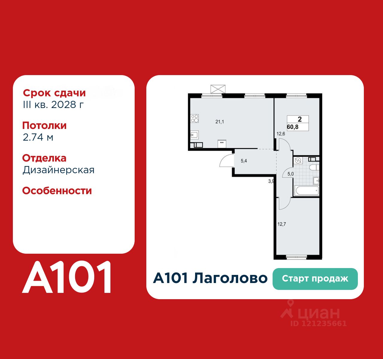 Старт продаж! 2-комнатная квартира площадью 60.76 в ЖК "А101 Лаголово" на 7 этаже. Квартира с отделкой. Вид из окна на улицу. В квартире 1 санузел. Высота потолков 2.74 м.