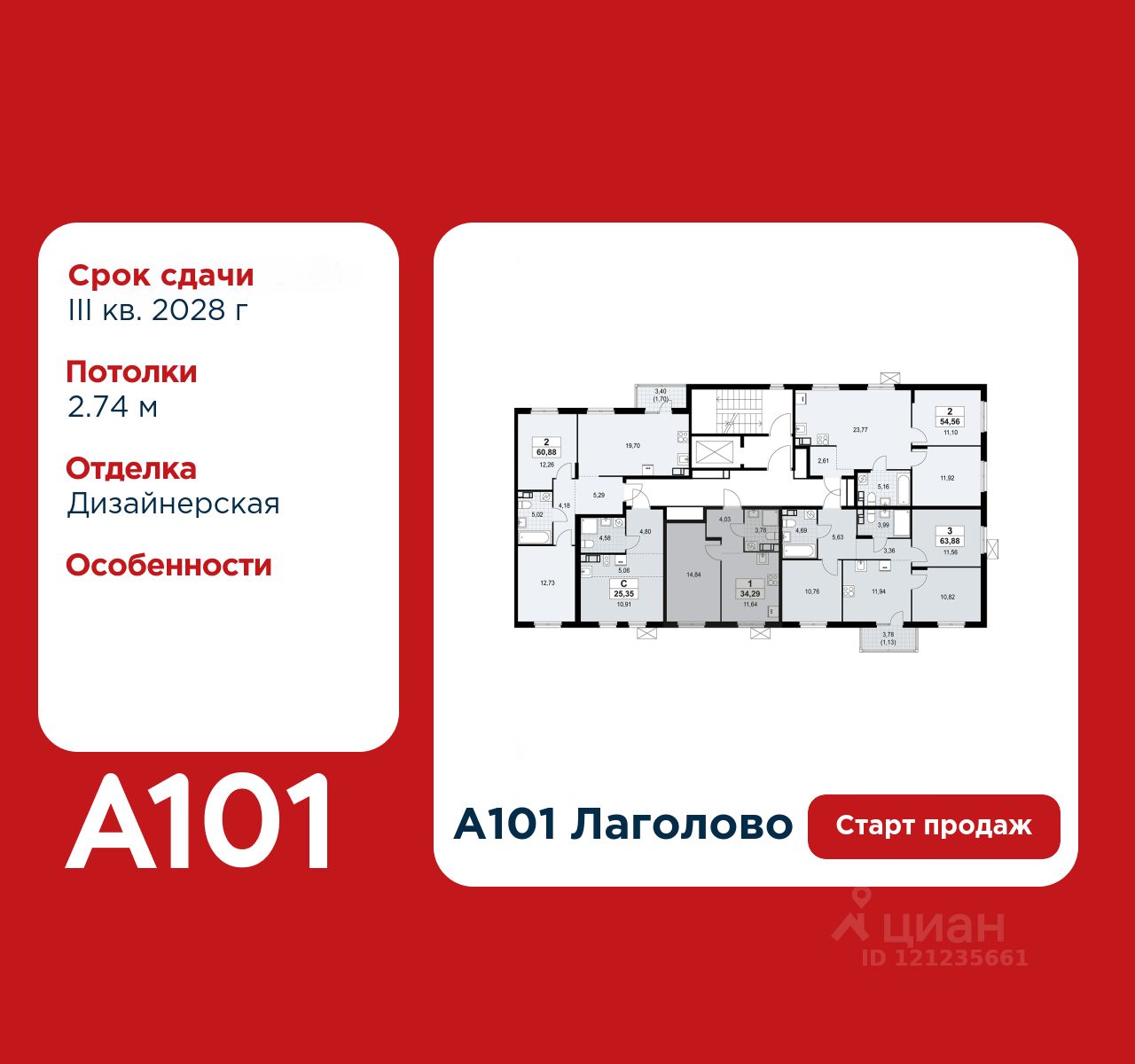 Старт продаж! 1-комнатная квартира площадью 34.29 в ЖК "А101 Лаголово" на 9 этаже. Квартира с отделкой. Вид из окна на улицу. В квартире 1 санузел. Высота потолков 2.74 м.