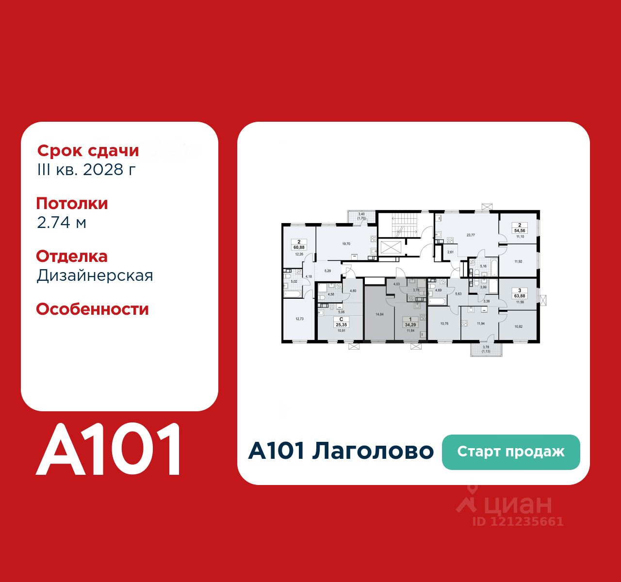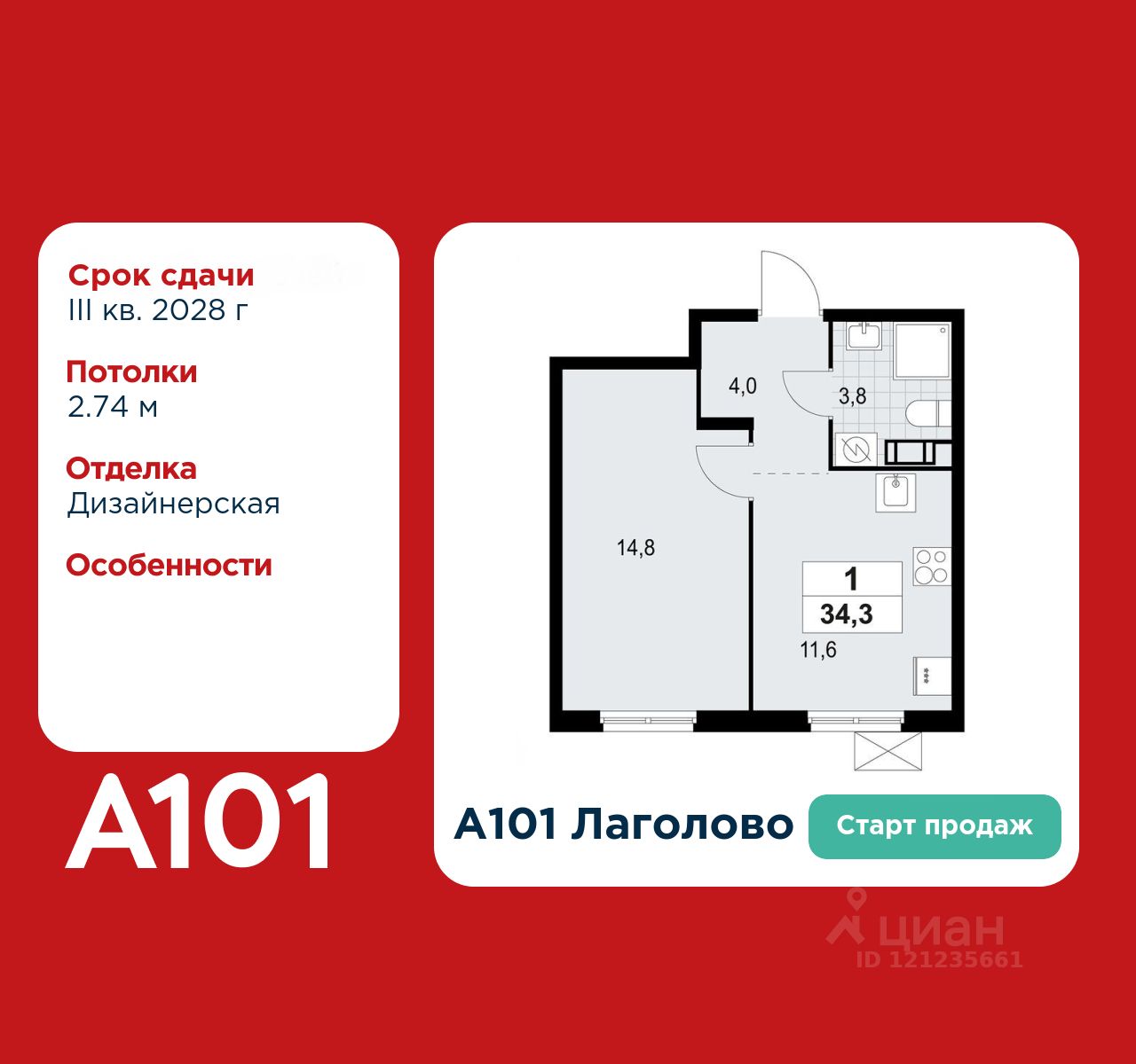 Старт продаж! 1-комнатная квартира площадью 34.29 в ЖК "А101 Лаголово" на 7 этаже. Квартира с отделкой. Вид из окна на улицу. В квартире 1 санузел. Высота потолков 2.74 м.