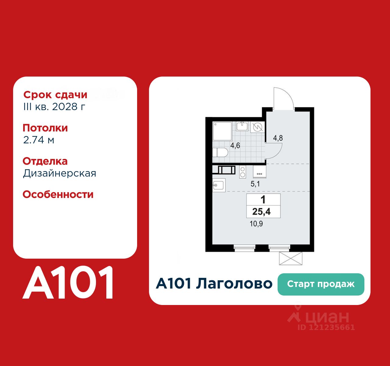 Старт продаж! Студия площадью 25.35 в ЖК "А101 Лаголово" на 7 этаже. Квартира с отделкой. Вид из окна на улицу. В квартире 1 санузел. Высота потолков 2.74 м. Предложения от застройщика на декабрь 2025: - Гибкая рассрочка 20 000 руб/мес. и первым взносом 10%. ОТДЕЛКА Для квартир с чистовой отделкой предлагается три варианта дизайна: Классика, Карелия светлая и Карелия темная. Варианты всех дизайнерских решений представлены на фотографиях. Подробности можно уточнить у менеджера. На все отделочные работы от застройщика предоставляется гарантия. ОСОБЕННОСТИ ПЛАНИРОВКИ Планировка студии компактная и продуманная. Благодаря форме, близкой к квадрату, а не прямоугольнику, в квартире два полноценных окна, что обеспечивает большое количество естественного света. ПАРАДНАЯ. В каждой парадной предусмотрены места для хранения велосипедов и колясок, гостевой санузел и удобная зона ожидания для гостей. ДВОРЫ И ОКРУЖЕНИЕ. Просторные дворы безопасны для детей, так как свободны от машин, закрыты от посторонних и постоянно находятся под видеонаблюдением. Во дворах создается разнообразная среда для детей всех возрастов: детские площадки с батутами, тактильными дорожками и игровыми комплексами. Для активного отдыха - воркаут-площадки, столы для пинг-понга и газоны для занятий йогой. Во дворах есть и тихие уголки - зеленые гостиные с уличной мебелью, где можно поработать на свежем воздухе или отдохнуть в тишине. Из внутренних дворов комплекса можно выйти на пешеходный бульвар длиной около 900 метров. Здесь будет организовано полноценное общественное пространство с амфитеатром, уличным кафе, ручьем, фонтаном и множеством мест для отдыха и игр. Большую часть бульвара займут благоустроенные зеленые зоны и теневые сады из десятков видов деревьев и кустарников, многолетних цветов и трав, которые будут радовать глаз круглый год. "А101 Лаголово" - современный город у подножия знаменитых Дудерговских высот, в объятиях чистейших озер и зеленых живописных массивов, наполненный всем необходимым для счастливой жизни. ИНФРАСТРУКТУРА. Мы занимаемся комплексным освоением территории. Наш приоритет - доступность всех сервисов для счастливой жизни. 1. Лаголово-город 15-ти минутной доступности. Вся необходимая инфраструктура: магазины, салоны красоты, образовательные учреждения, медицинские центры находятся в 15-ти минутах пешей прогулки от любой точки жилого комплекса. Это позволяет не тратить время на долгие перемещения. 2. Представьте идеальный город, где ребенок может спокойно играть, а пожилой человек наслаждаться заслуженным отдыхом. Жилая среда нашего комплекса может комфортно использоваться как 8-летним ребенком, так и 80-летним пожилым человеком. Дома, улицы, общественные пространства, тротуары спроектированы с заботой о людях разных возрастов. 3. Мы активно развиваем авторскую образовательную экосистему "Лёрнити". Она включает строительство 8 современных детских садов (2000 мест) и 3 школ (2945 учащихся). Мы учим родителей гармонично общаться с детьми, помогаем мал
