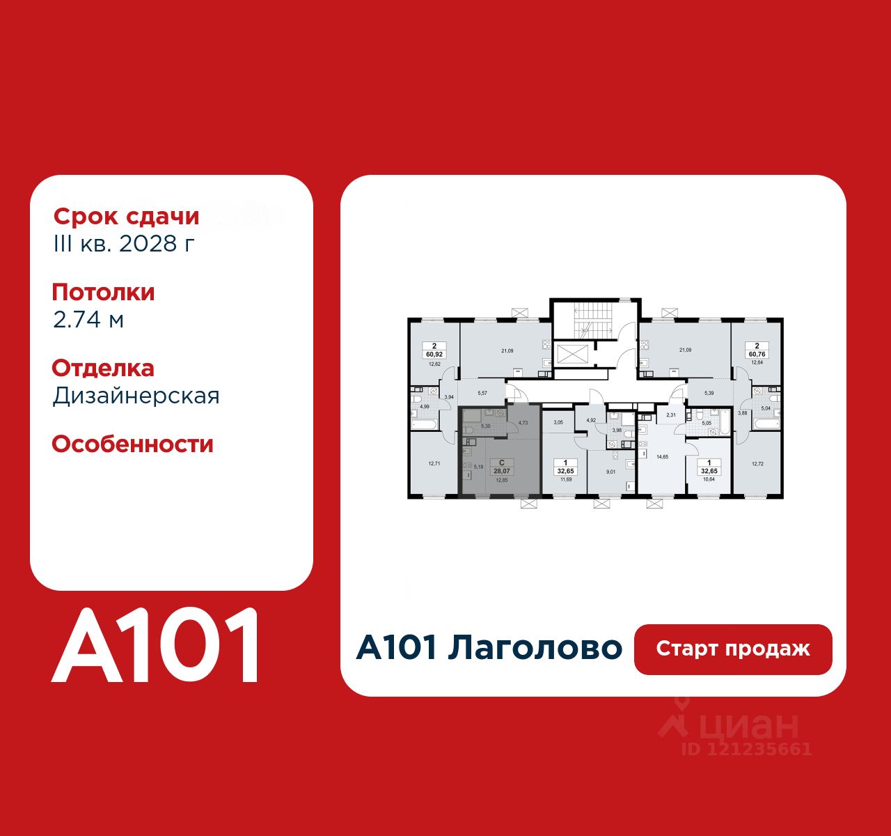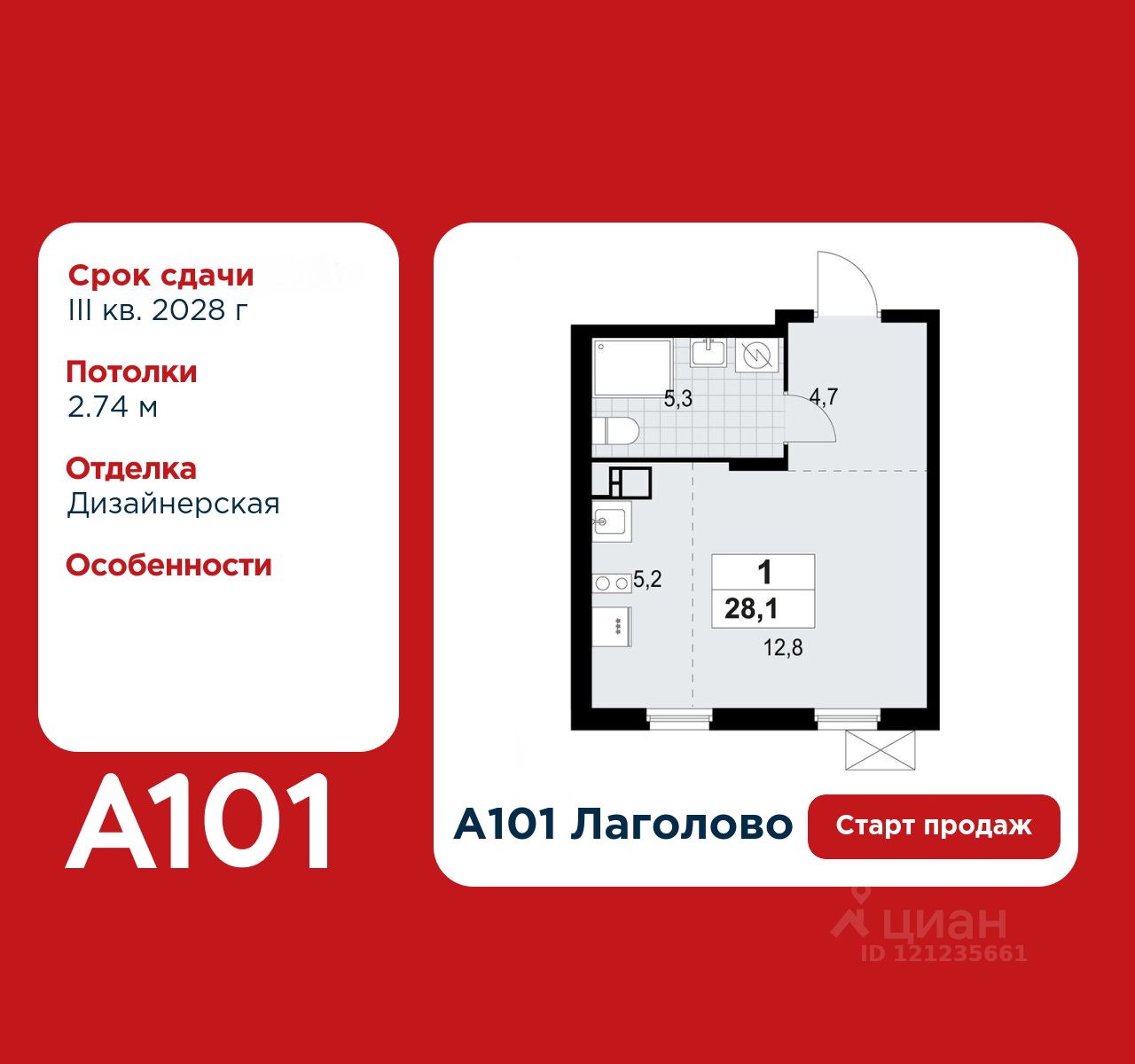 Старт продаж! Студия площадью 28.07 в ЖК "А101 Лаголово" на 6 этаже. Квартира с отделкой. Вид из окна на улицу. В квартире 1 санузел. Высота потолков 2.74 м.