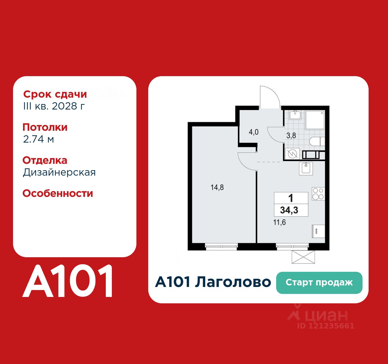 Старт продаж! 1-комнатная квартира площадью 34.29 в ЖК "А101 Лаголово" на 6 этаже. Квартира с отделкой. Вид из окна на улицу. В квартире 1 санузел. Высота потолков 2.74 м.