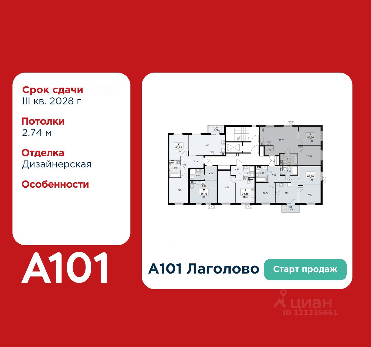 Старт продаж! 2-комнатная квартира площадью 54.56 в ЖК "А101 Лаголово" на 6 этаже. Квартира с отделкой. Вид из окна на улицу. В квартире 1 санузел. Высота потолков 2.74 м.