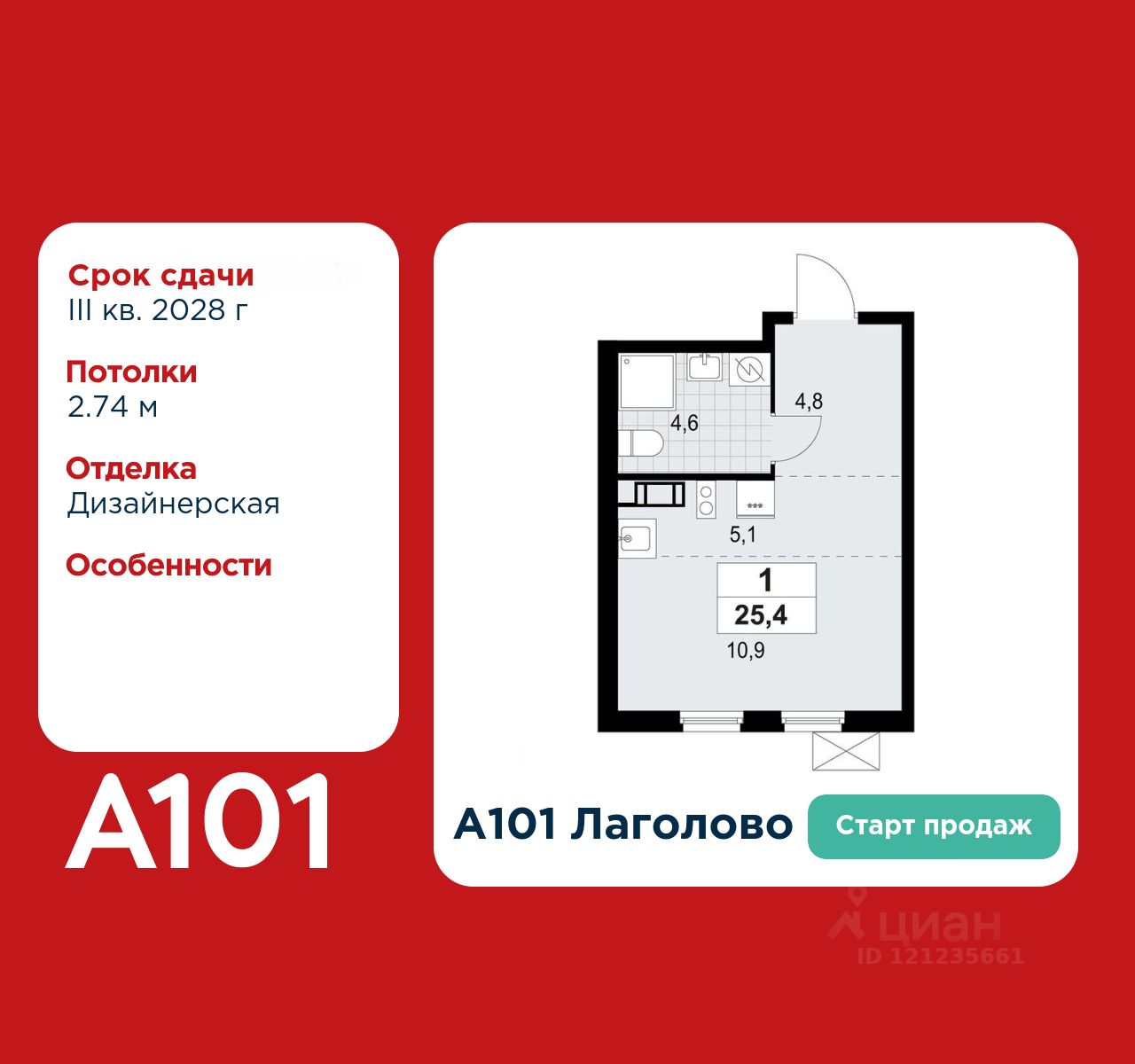 Старт продаж! Студия площадью 25.35 в ЖК "А101 Лаголово" на 6 этаже. Квартира с отделкой. Вид из окна на улицу. В квартире 1 санузел. Высота потолков 2.74 м.