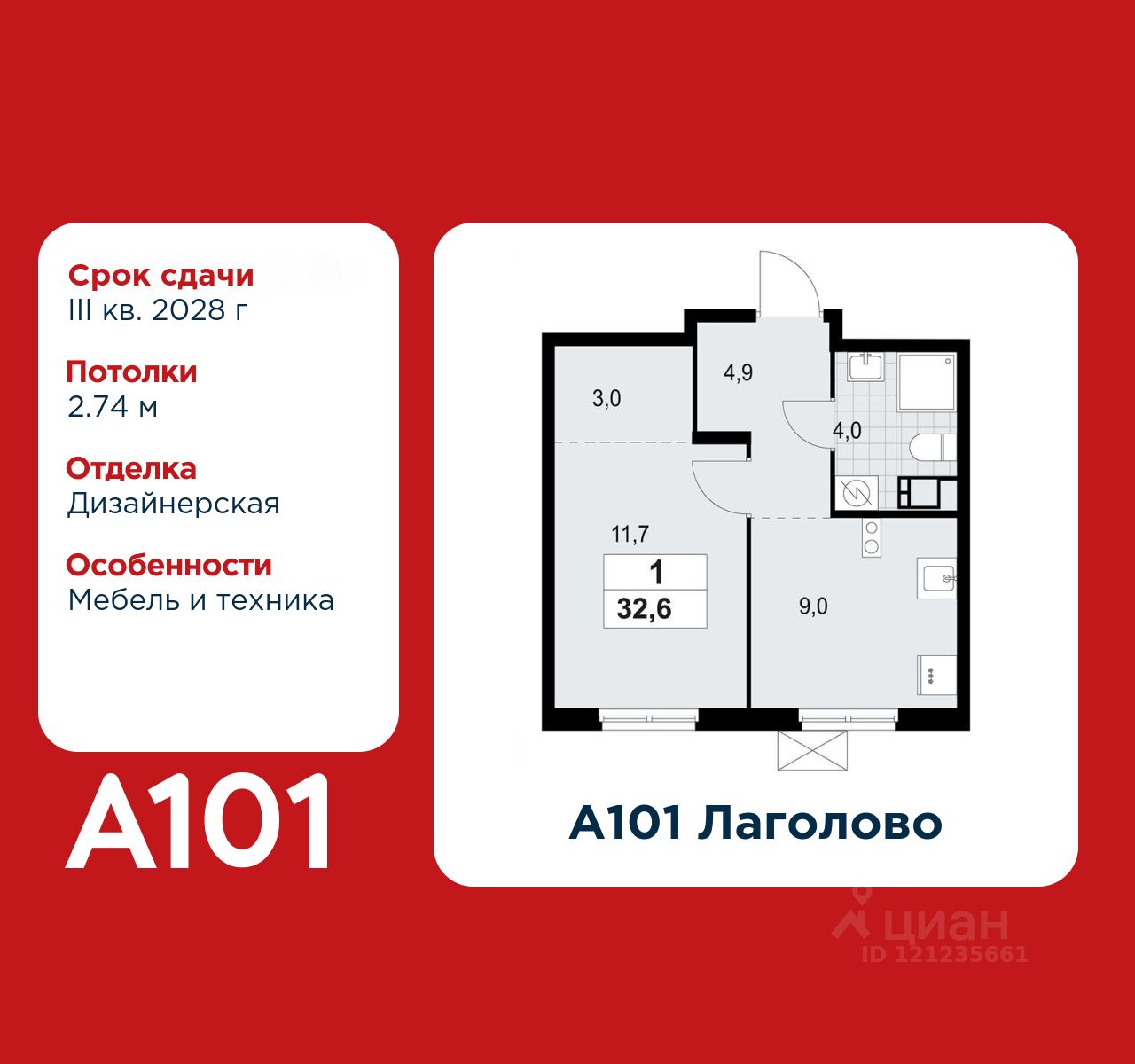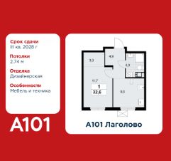1-комнатная квартира площадью 32.65 в ЖК "А101 Лаголово" на 5 этаже. Квартира с отделкой. Вид из окна на улицу. В квартире 1 санузел. Высота потолков 2.74 м. Ключи в 2025 году.
