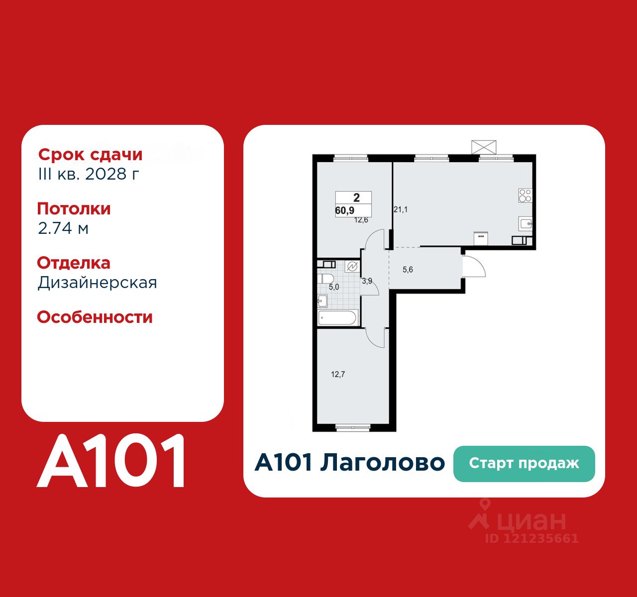 Старт продаж! 2-комнатная квартира площадью 60.92 в ЖК "А101 Лаголово" на 5 этаже. Квартира с отделкой. Вид из окна на улицу. В квартире 1 санузел. Высота потолков 2.74 м.