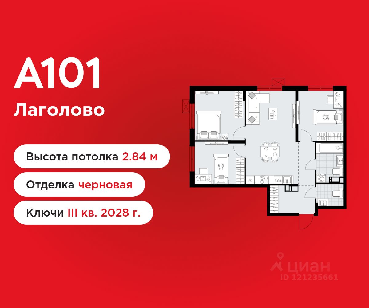 3-комнатная квартира площадью 71.07 в ЖК "А101 Лаголово" на 4 этаже. Квартира без отделки. Вид из окна во двор. В квартире 2 санузла. Высота потолков 2.84 м. Особенность планировки - гардеробная.