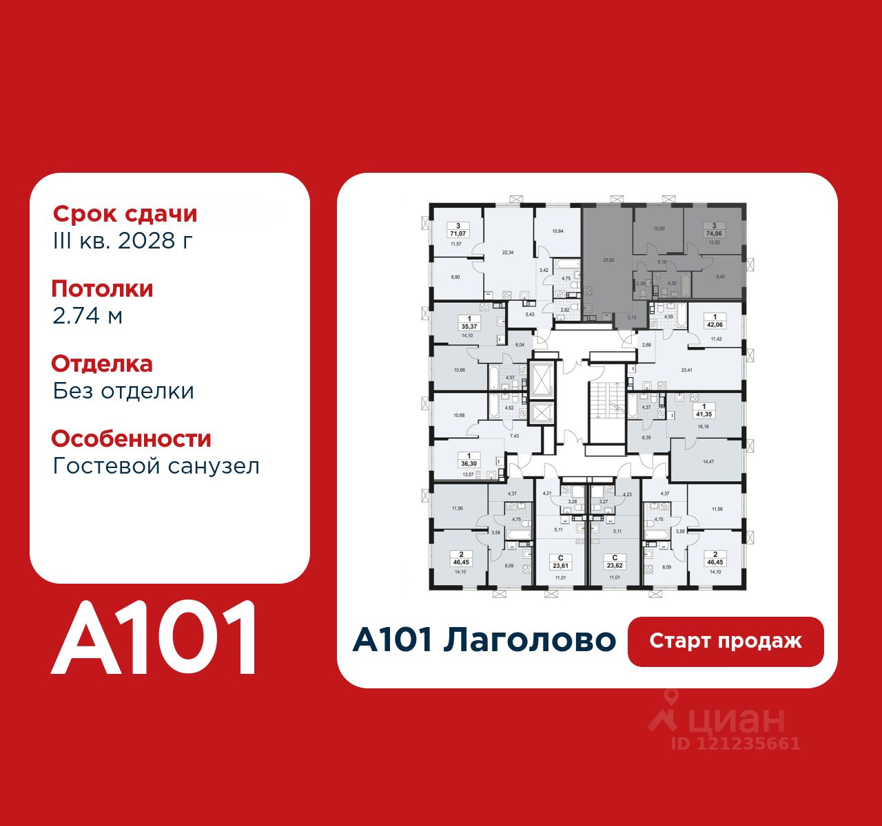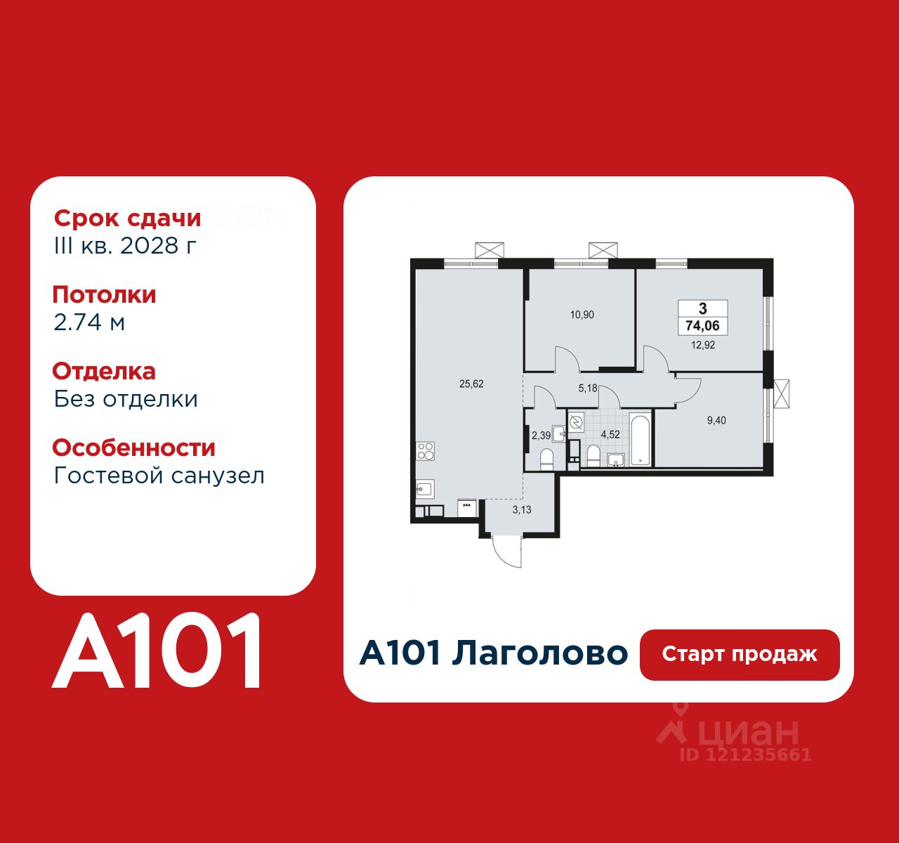Старт продаж! 3-комнатная квартира площадью 74.06 в ЖК "А101 Лаголово" на 4 этаже. Квартира без отделки. Вид из окна во двор. В квартире 2 санузла. Высота потолков 2.74 м.