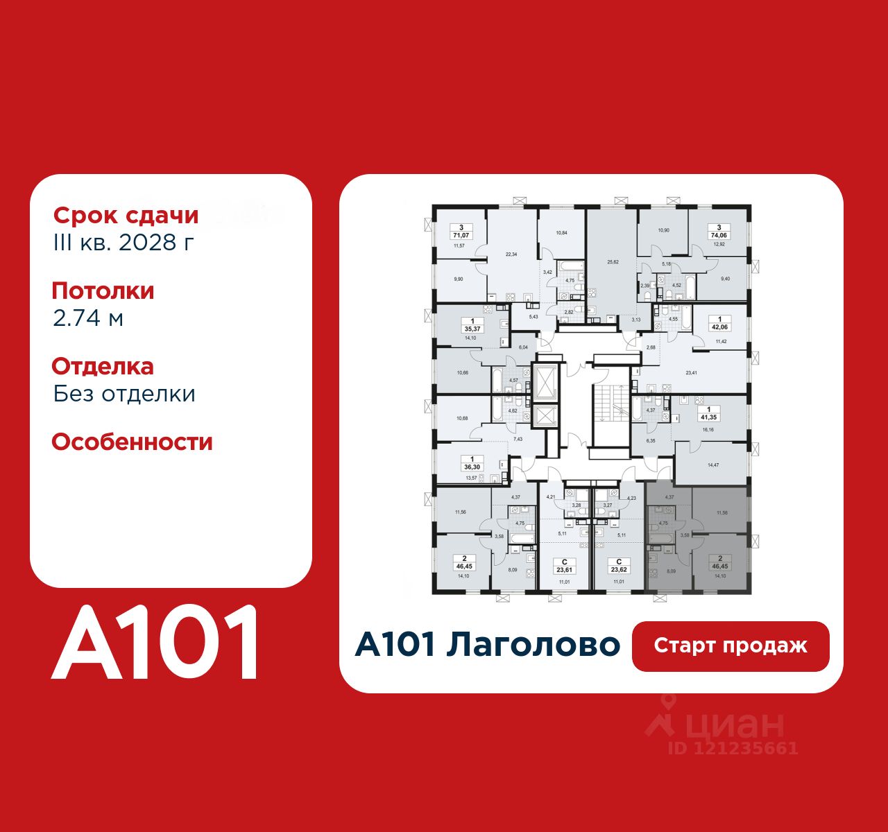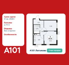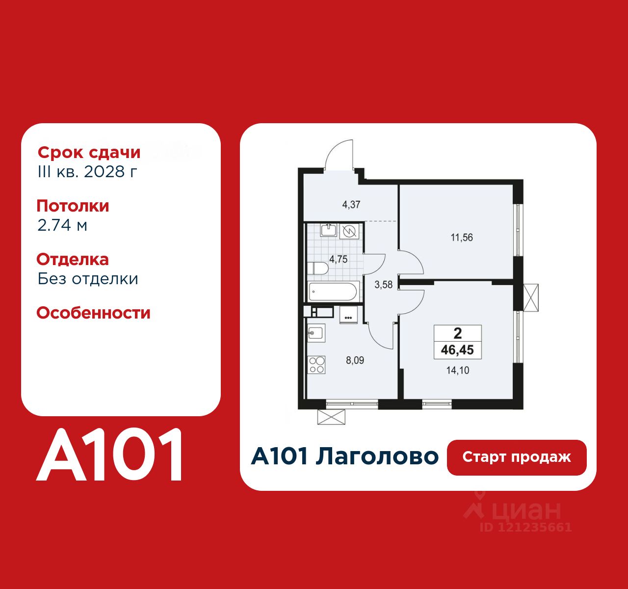 Старт продаж! 2-комнатная квартира площадью 46.45 в ЖК "А101 Лаголово" на 4 этаже. Квартира без отделки. Вид из окна во двор. В квартире 1 санузел. Высота потолков 2.74 м.