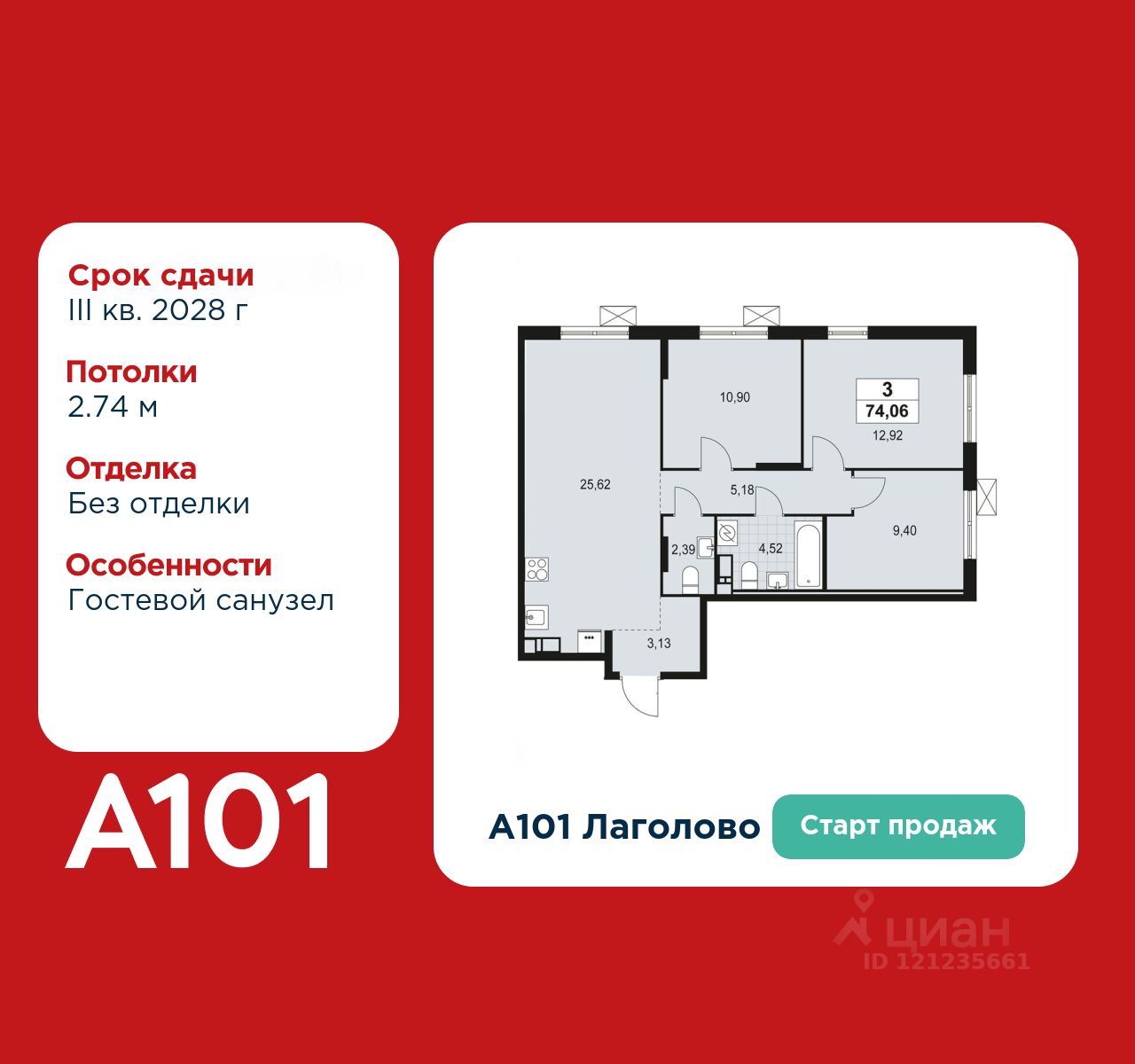 Старт продаж! 3-комнатная квартира площадью 74.06 в ЖК "А101 Лаголово" на 13 этаже. Квартира без отделки. Вид из окна на улицу. В квартире 2 санузла. Высота потолков 2.74 м.