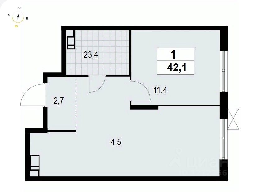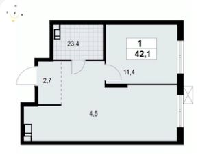1-комнатная квартира площадью 42.06 в ЖК "А101 Лаголово" на 13 этаже. Квартира без отделки. Вид из окна на улицу. Высота потолков 2.74 м. Ключи в 2025 году.