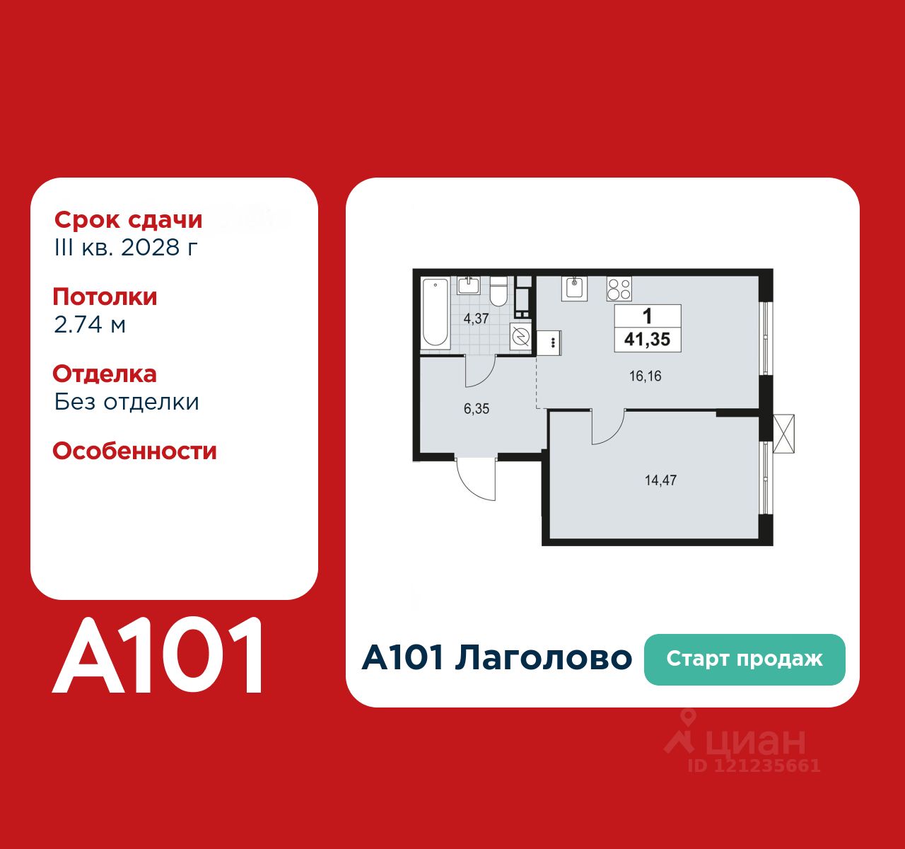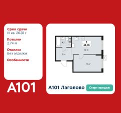Старт продаж! 1-комнатная квартира площадью 41.35 в ЖК "А101 Лаголово" на 13 этаже. Квартира без отделки. Вид из окна во двор. В квартире 1 санузел. Высота потолков 2.74 м.