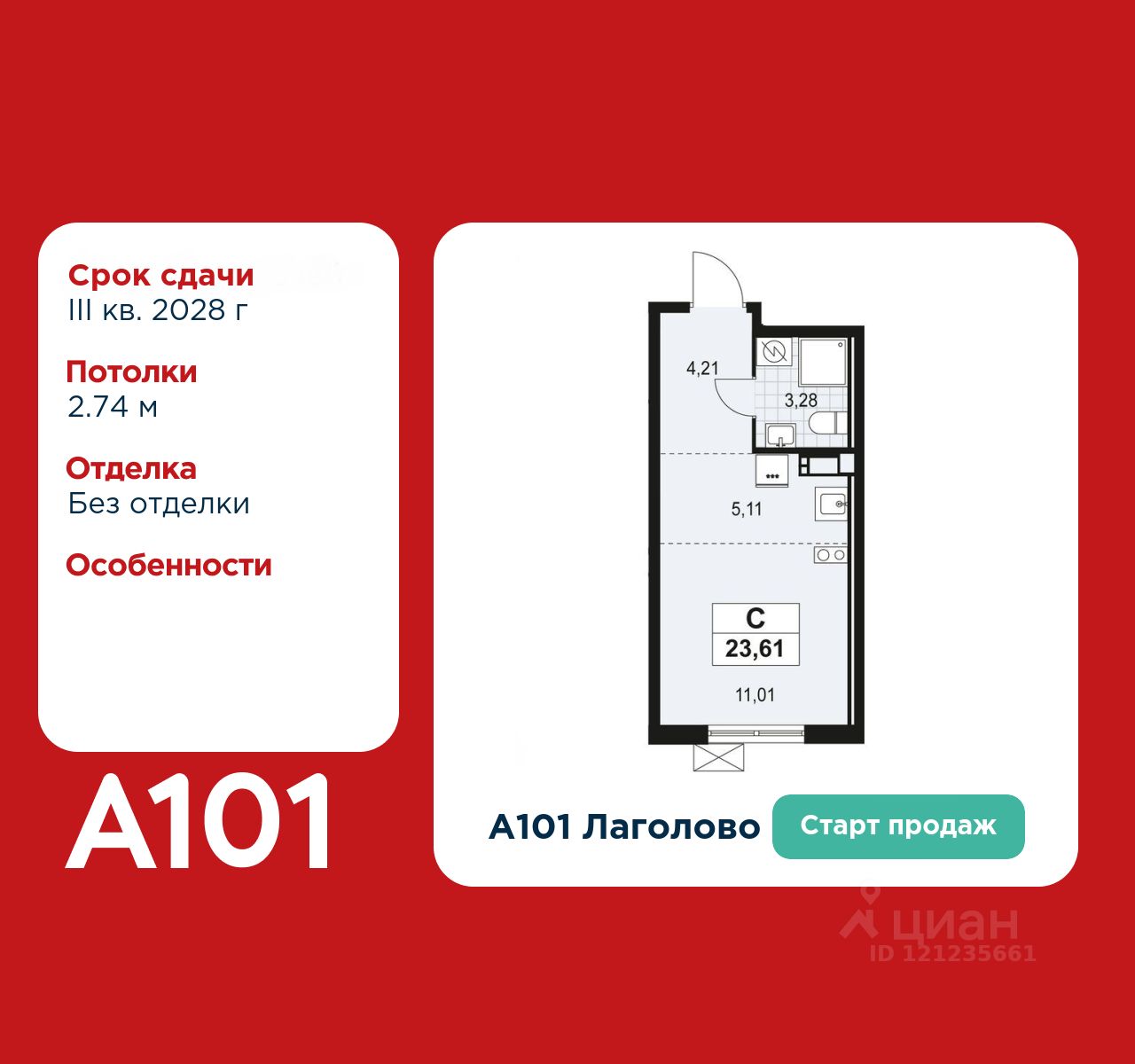 Старт продаж! Студия площадью 23.61 в ЖК "А101 Лаголово" на 13 этаже. Квартира без отделки. Вид из окна во двор. В квартире 1 санузел. Высота потолков 2.74 м.