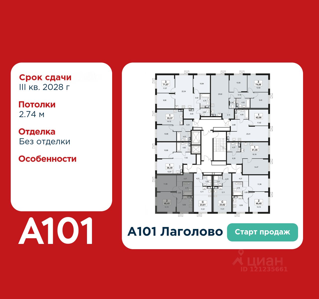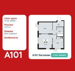 Старт продаж! 2-комнатная квартира площадью 46.45 в ЖК "А101 Лаголово" на 13 этаже. Квартира без отделки. Вид из окна на улицу. В квартире 1 санузел. Высота потолков 2.74 м.