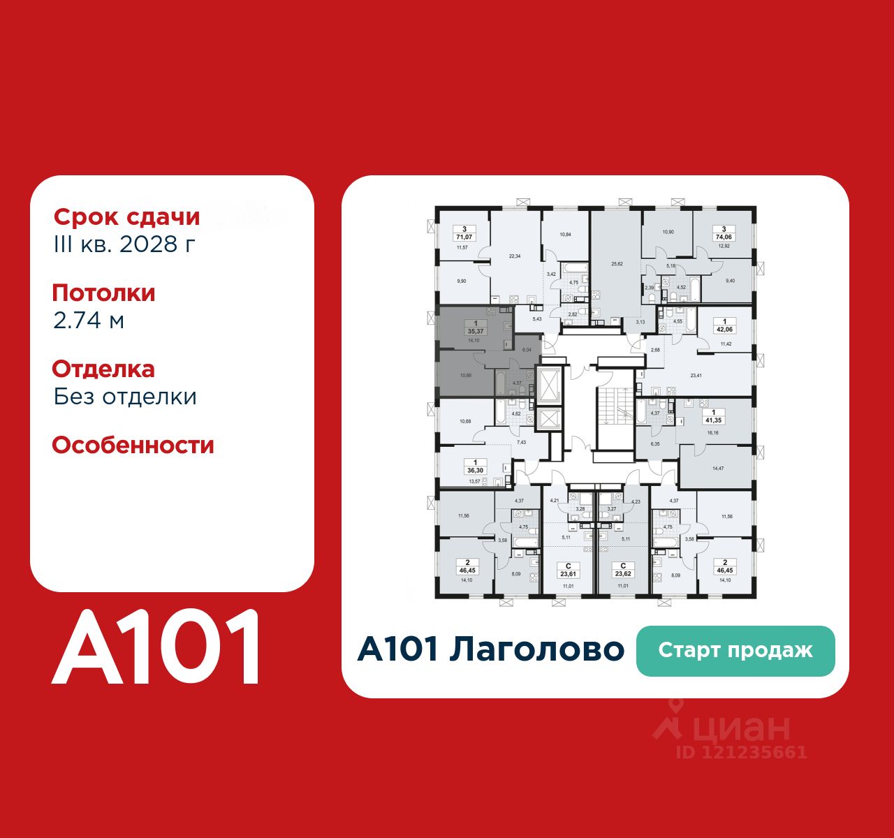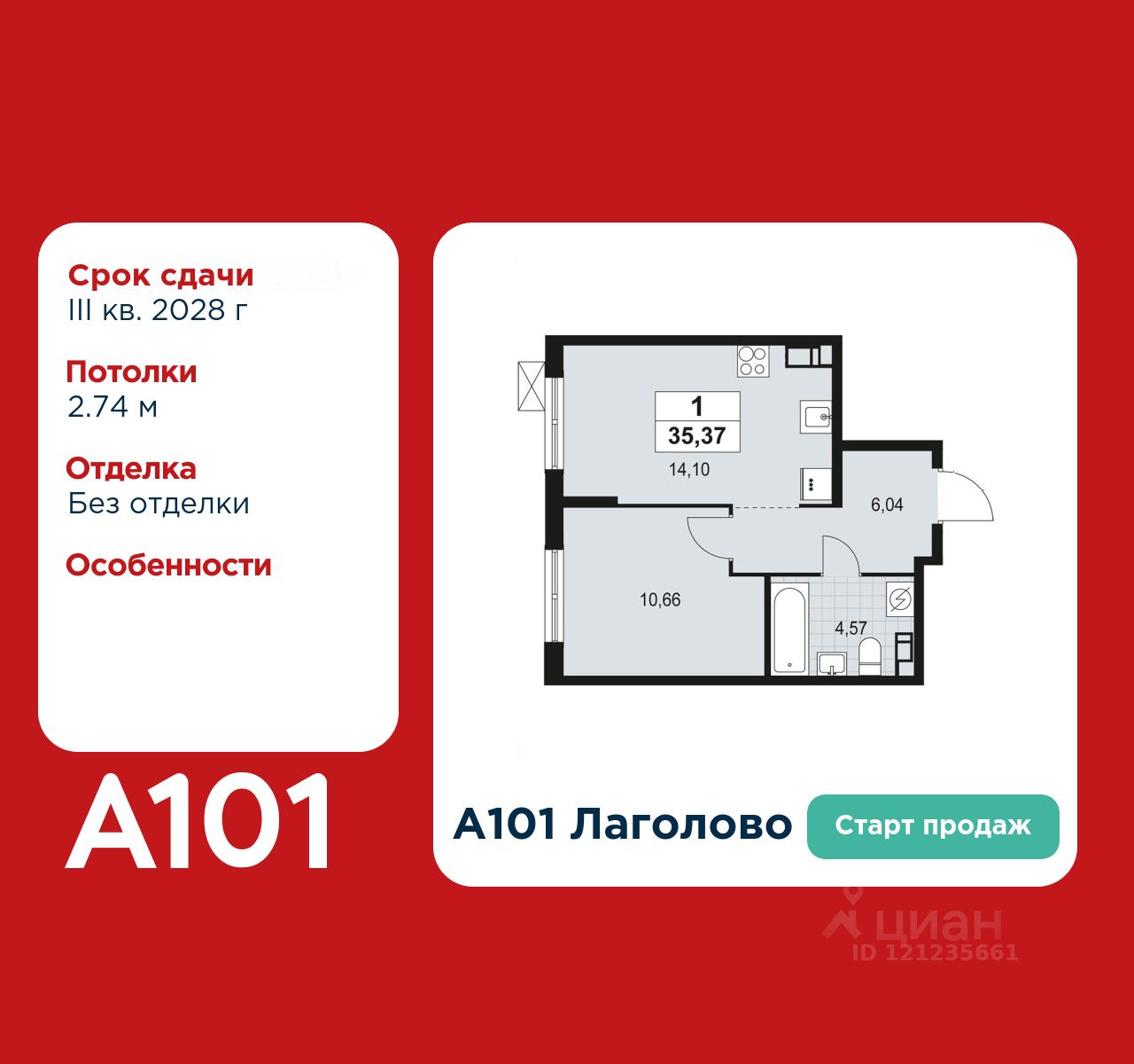Старт продаж! 1-комнатная квартира площадью 35.37 в ЖК "А101 Лаголово" на 13 этаже. Квартира без отделки. Вид из окна во двор. В квартире 1 санузел. Высота потолков 2.74 м.