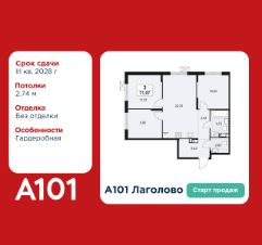 Старт продаж! 3-комнатная квартира площадью 71.07 в ЖК "А101 Лаголово" на 13 этаже. Квартира без отделки. Вид из окна на улицу. В квартире 2 санузла. Высота потолков 2.74 м. Особенность планировки - гардеробная.