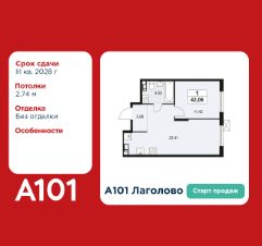 Старт продаж! 1-комнатная квартира площадью 42.06 в ЖК "А101 Лаголово" на 12 этаже. Квартира без отделки. Вид из окна на улицу. В квартире 1 санузел. Высота потолков 2.74 м.