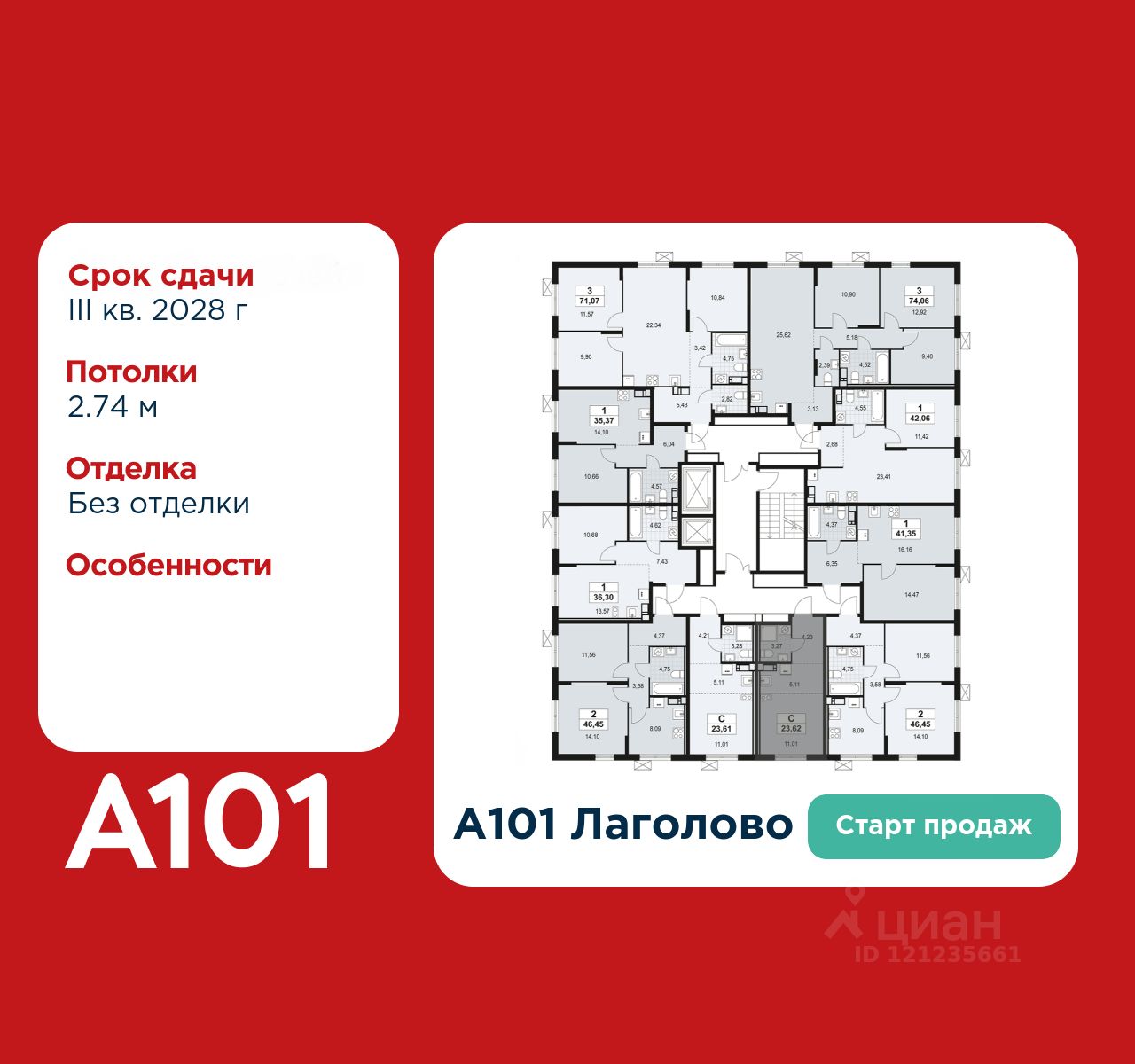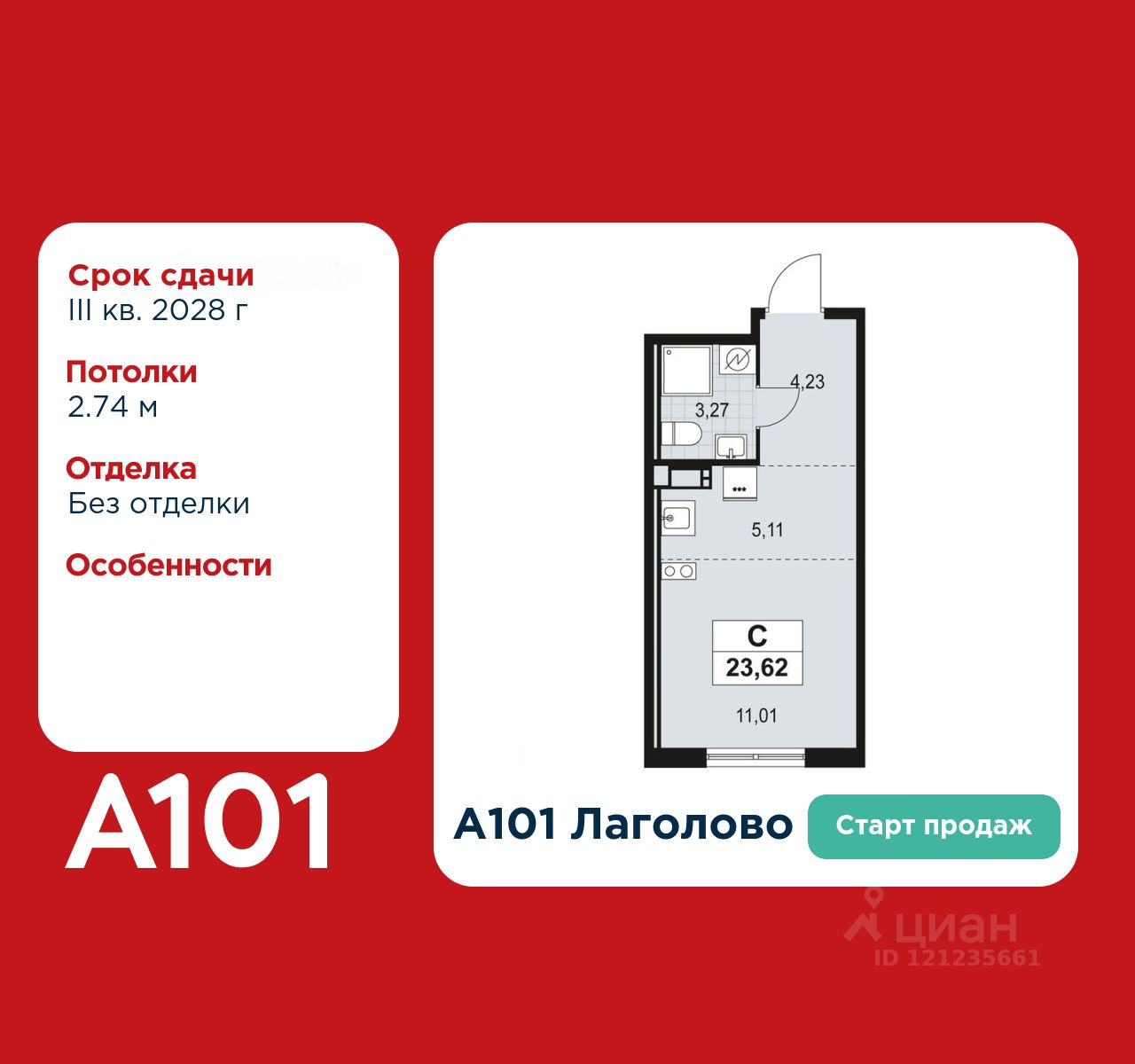 Старт продаж! Студия площадью 23.62 в ЖК "А101 Лаголово" на 12 этаже. Квартира без отделки. Вид из окна на улицу. В квартире 1 санузел. Высота потолков 2.74 м.