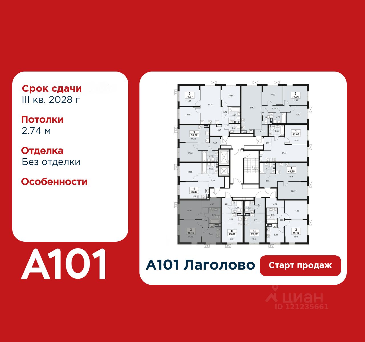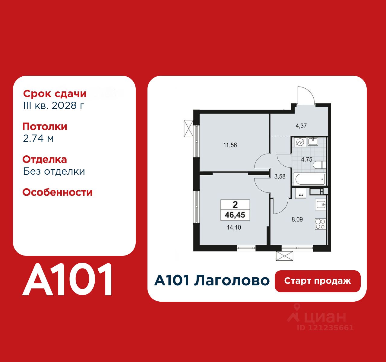 Старт продаж! 2-комнатная квартира площадью 46.45 в ЖК "А101 Лаголово" на 11 этаже. Квартира без отделки. Вид из окна на улицу. В квартире 1 санузел. Высота потолков 2.74 м.