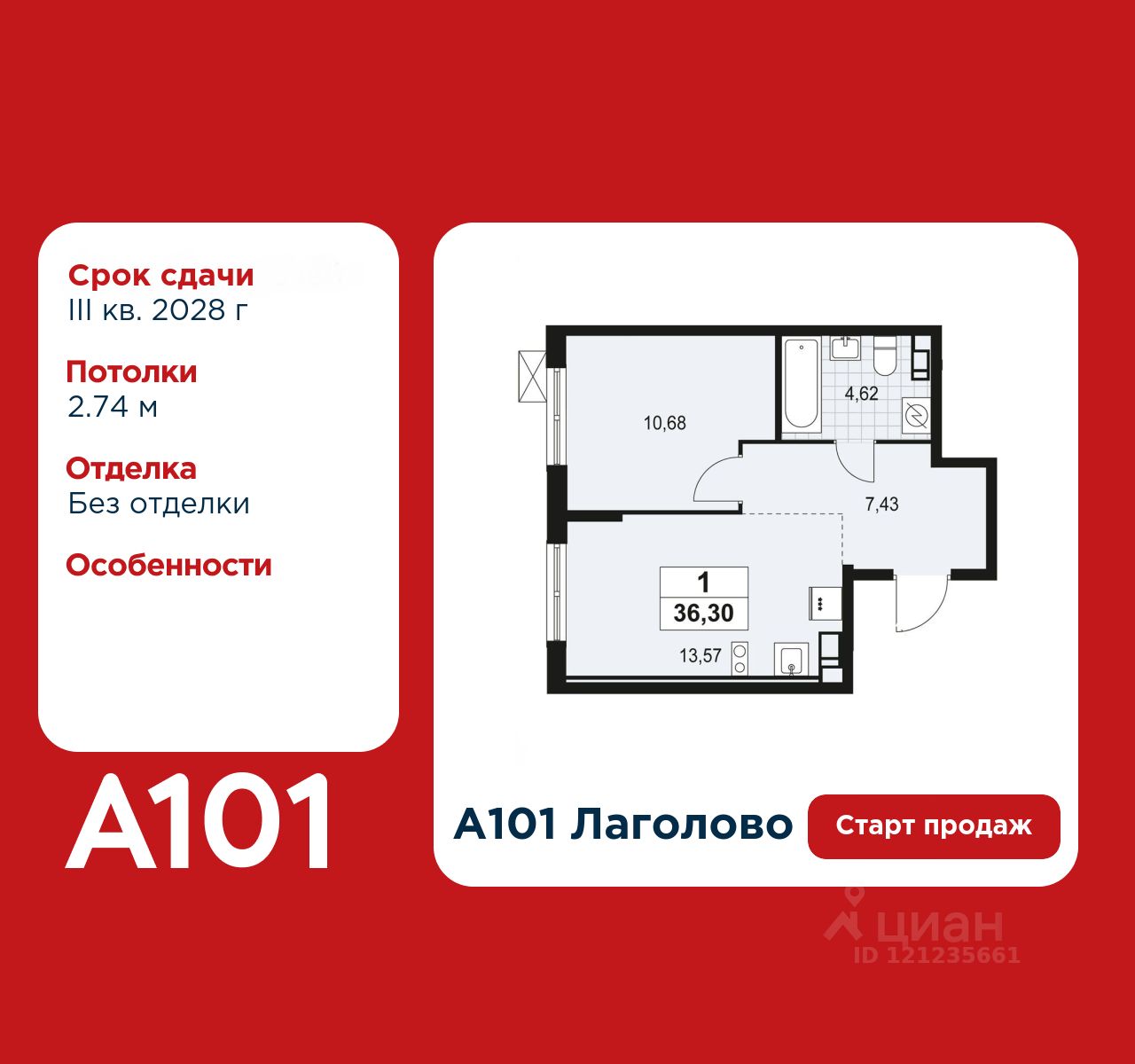 Старт продаж! 1-комнатная квартира площадью 36.30 в ЖК "А101 Лаголово" на 9 этаже. Квартира без отделки. Вид из окна на улицу. В квартире 1 санузел. Высота потолков 2.74 м.