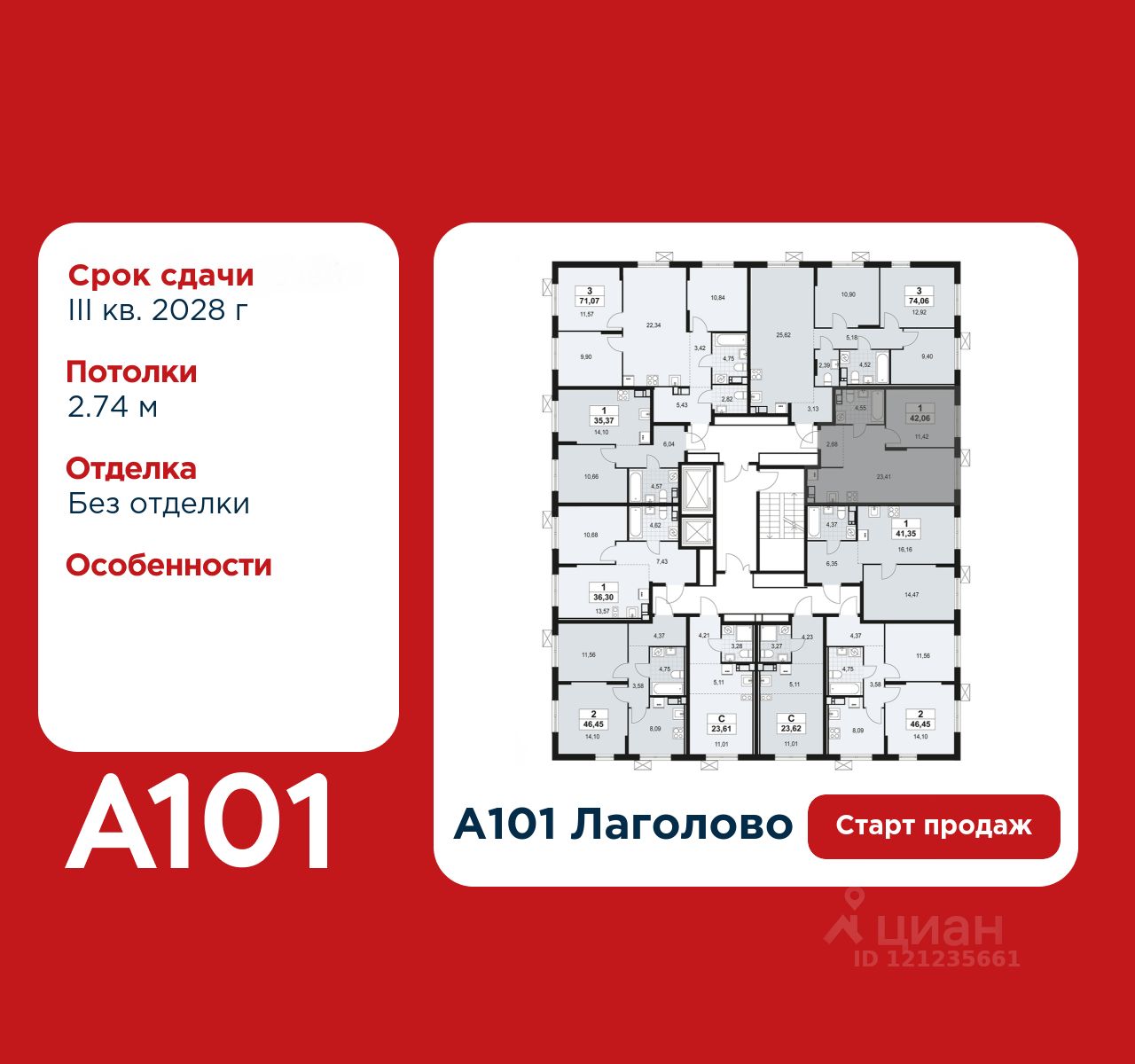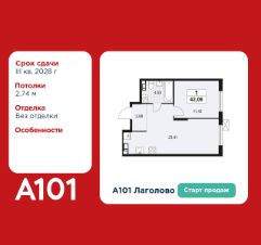 Старт продаж! 1-комнатная квартира площадью 42.06 в ЖК "А101 Лаголово" на 9 этаже. Квартира без отделки. Вид из окна на улицу. В квартире 1 санузел. Высота потолков 2.74 м.